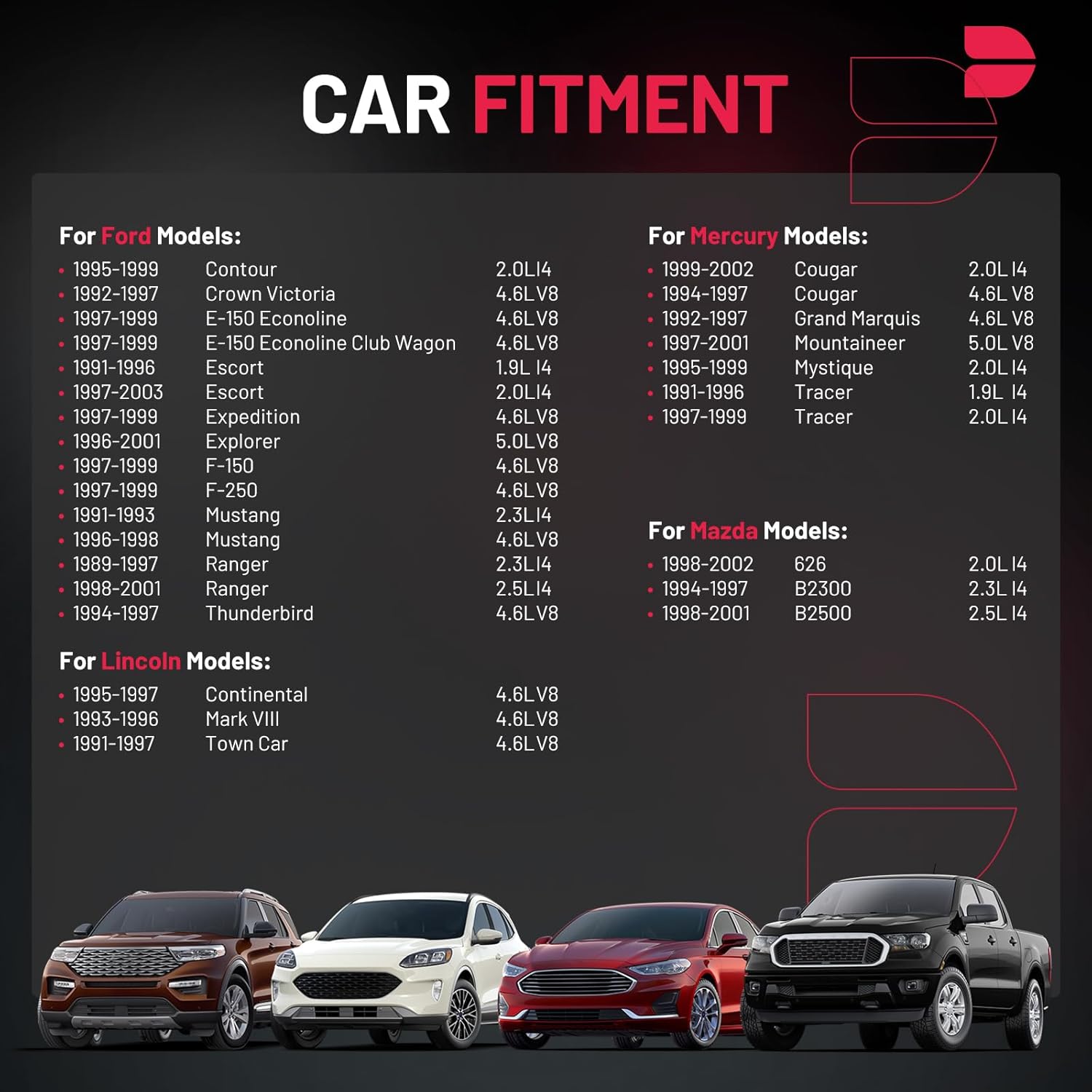 【Compatible with】Please confirm compatibility based on your vehicle's year, brand, model, and the OE number of the replacement coils.Ignition coils Compatible with Ford Contour Crown Victoria E150 Escort Expedition Explorer F150 F250 Mustang Ranger Thunderbird;Compatible with Lincoln Continental Mark VIII Town Car;Compatible with Mazda 626 B2300 B2500 ;Compatible with Mercury Cougar Grand Marquis Mountaineer Mystique Tracer. More information can be found in the pictures or on the details page.