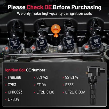 【OE Standard Performance】Exquisite craftsmanship design, 100% brand new high quality ignition coil pack, OE grade durability, bring you ultimate comfortable driving experience.OE No. 1788386 5C1742 9212174 C753 E1104 E333 GN10623 LF2L18100 LF2L18100A UF604.