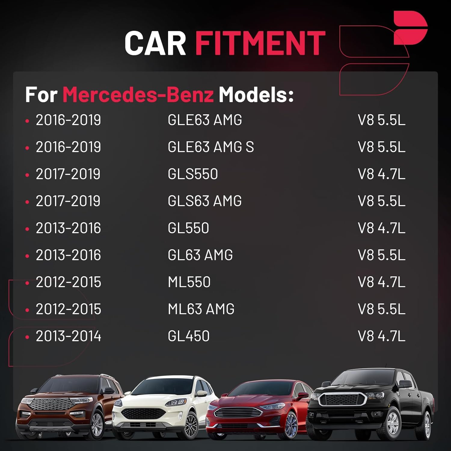 【Compatible with】Please confirm compatibility based on your vehicle's year, brand, model, and the OE number of the replacement coils.Ignition coils Compatible with Mercedes-Benz 2016-2019 GLE63 AMG V8 5.5L, 2017-2019 GLS550GLS63 AMG V8 5.5L, 2013-2016 GL550 V8 4.7L, 2013-2016 GL63 AMG V8 5.5L, 2012-2015 ML550 ML63 AMG V8 5.5L, 2013-2014 GL450 V8 4.7L.More information can be found in the pictures or on the details page.