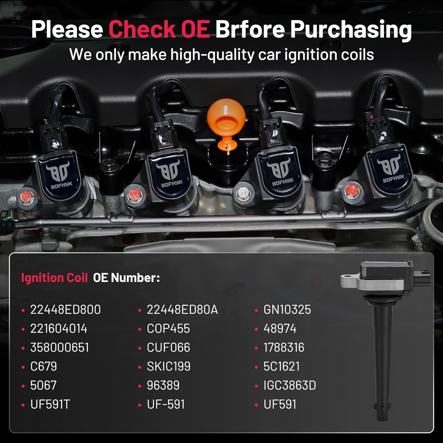 【About BDFHYK】We are a professional automotive component manufacturer with a mature industrial production line. If you encounter any issues with our ignition coil, please contact us immediately, and we will respond to you within 48 hours. We are committed to providing a 12-month quality guarantee service. Choose BDFHYK, choose high-quality coil packs.