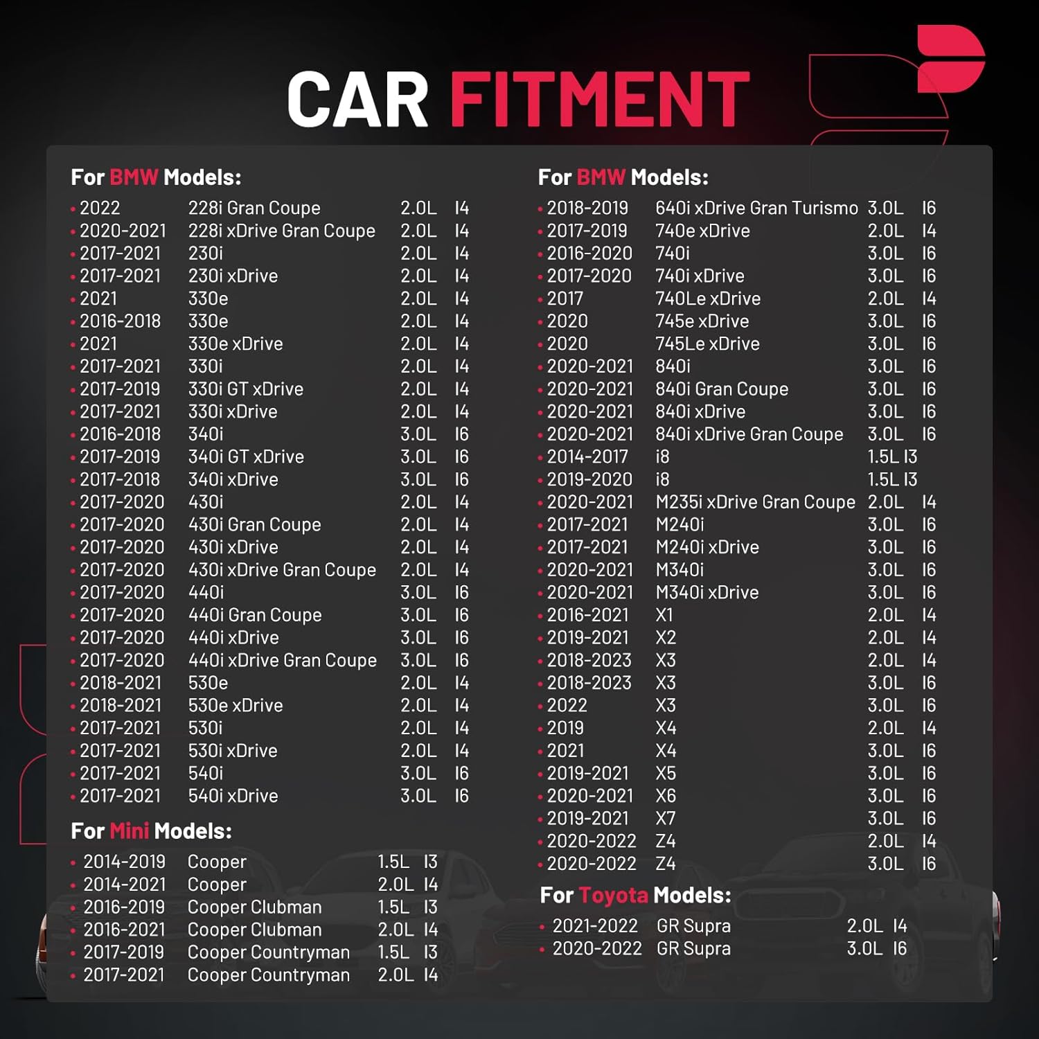 【Compatible with】Please confirm compatibility based on your vehicle's year, brand, model, and the OE number of the replacement coils.Ignition coils Compatible with 228i Gran Coupe 228i xDrive Gran Coupe 230i 230i xDrive 330e 330e xDrive 330i 330i GT xDrive 330i xDrive 340i 340i GT xDrive 340i xDrive 430i 430i Gran Coupe 430i xDrive 430i xDrive Gran Coupe etc.,X1 X2 X3 X4 X5 X6 X7 Z4, Cooper Cooper Clubman Cooper Countryman, GR Supra.