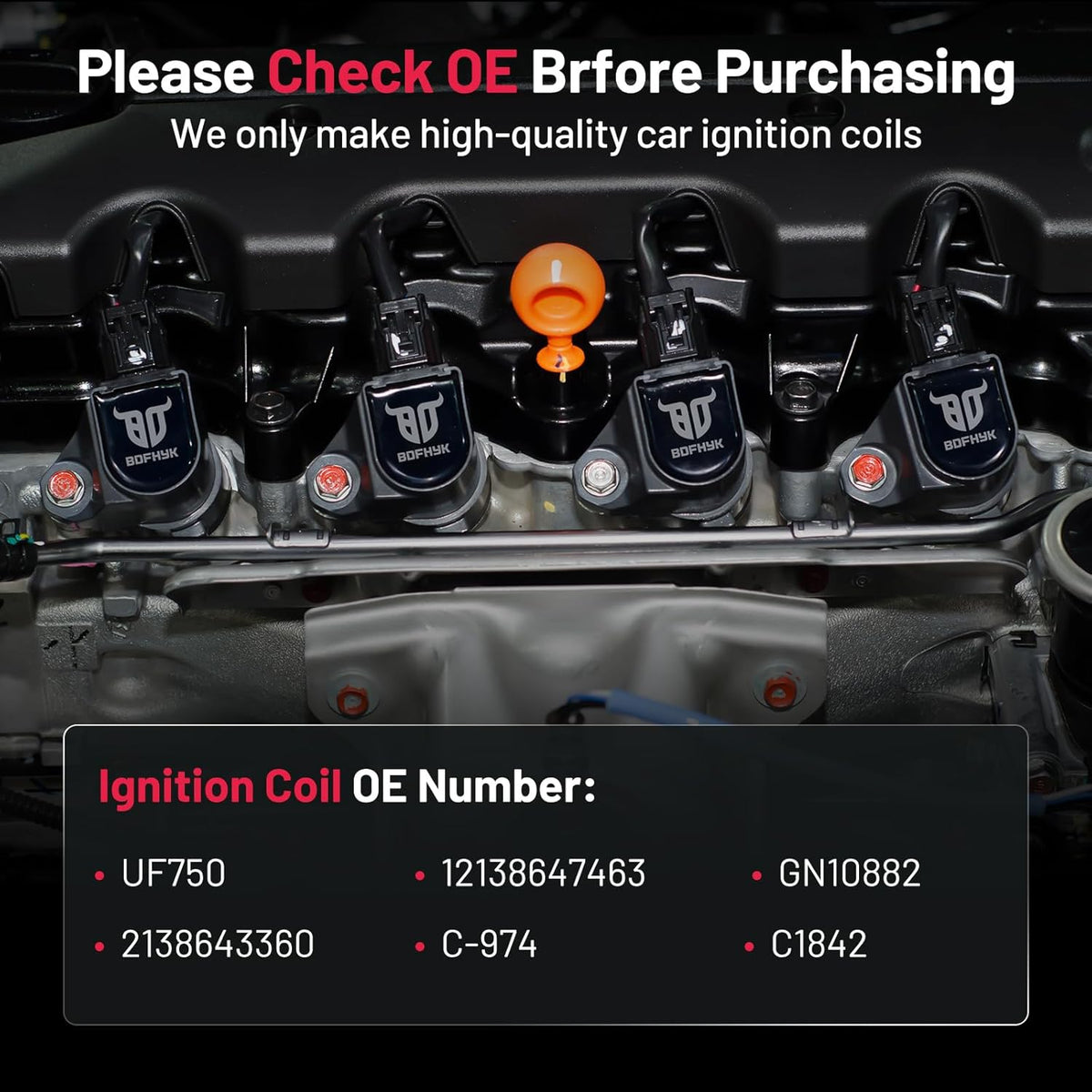 【OE Standard Performance】Exquisite craftsmanship design, 100% brand new high quality ignition coil pack, OE grade durability, bring you ultimate comfortable driving experience.OE No. UF750 12138647463 GN10882 2138643360 C-974 C1842.