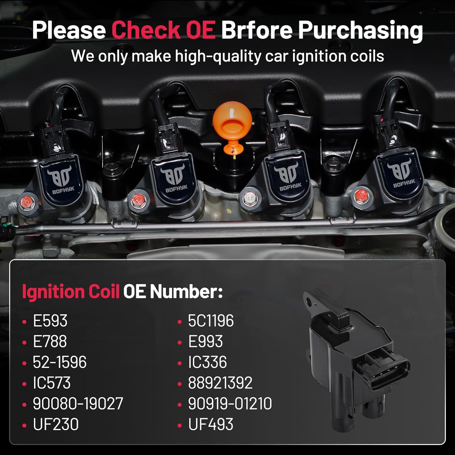 【About BDFHYK】We are a professional automotive component manufacturer with a mature industrial production line. If you encounter any issues with our ignition coil, please contact us immediately, and we will respond to you within 48 hours. We are committed to providing a 12-month quality guarantee service. Choose BDFHYK, choose high-quality coil packs.