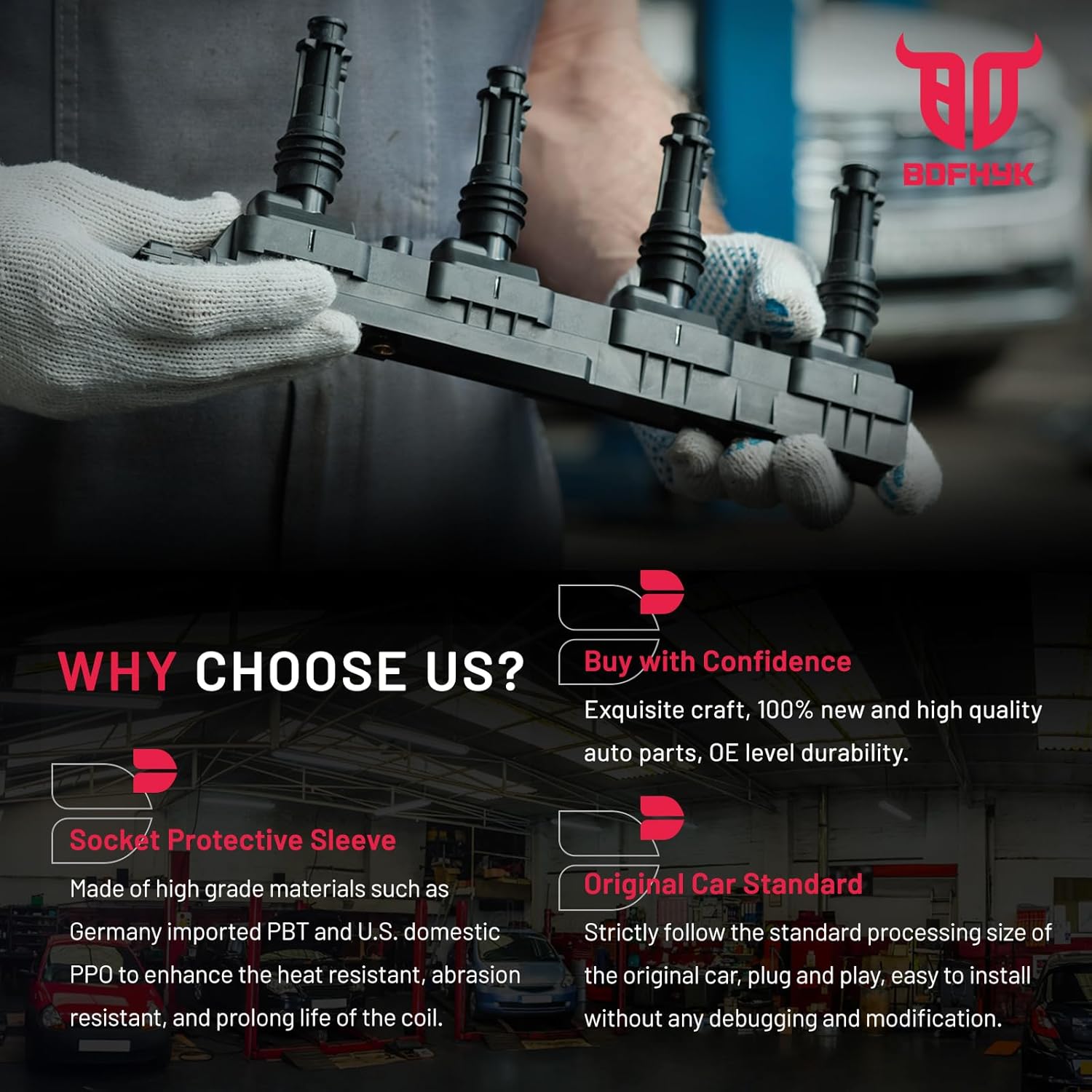 【Yes, you need a new coil and spark plug!】If your car has been used for a long time(over 80000km) and has problems like car shaking, start-up failure, speeding up slowly, and increasing fuel consumption, you may need to change a new set of spark plugs and coil packs. BDFHYK ignition coil packs and spark plugs can offer you a professional user experience and make your car like new. You may choose it with confidence.