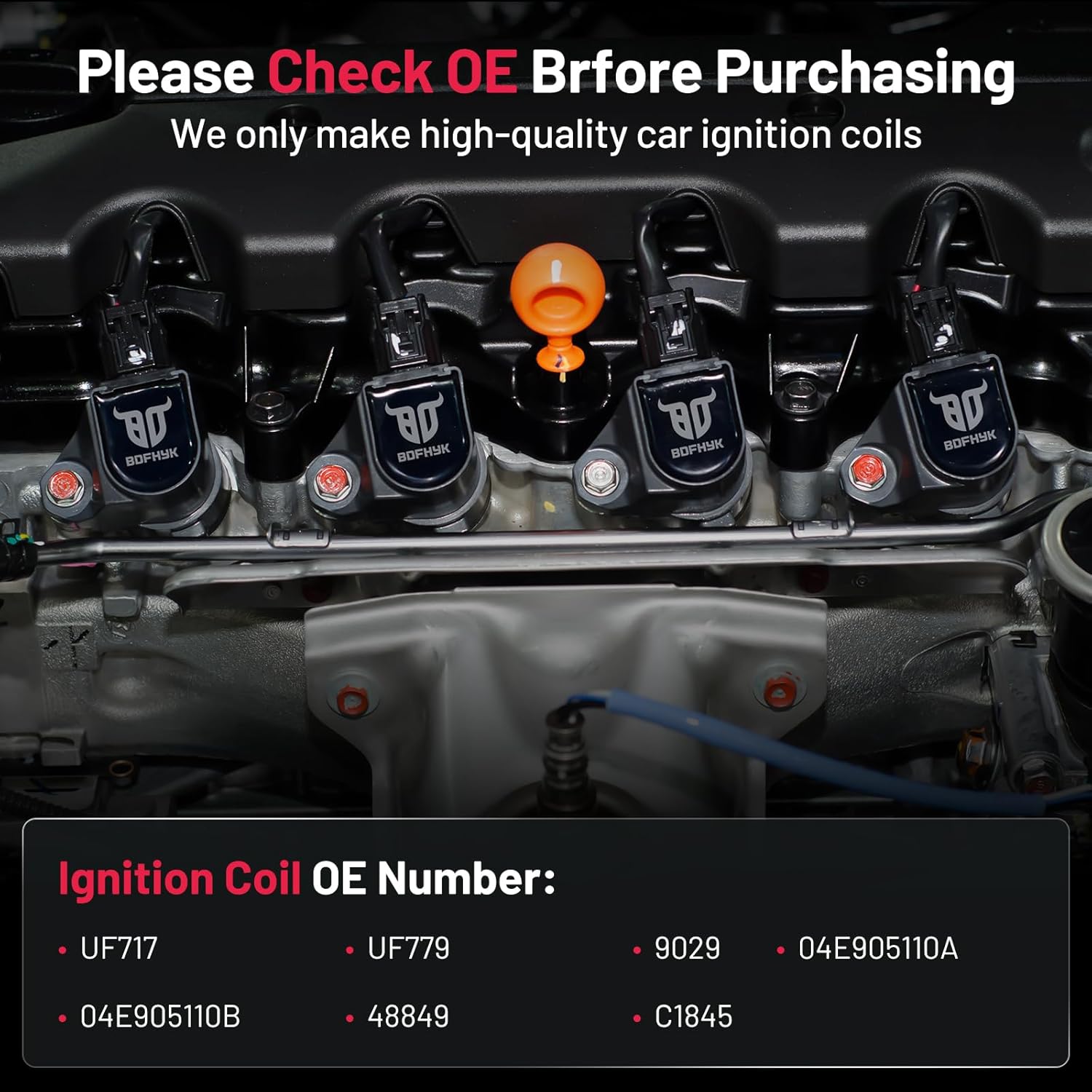 【OE Standard Performance】Exquisite craftsmanship design, 100% brand new high quality ignition coil pack, OE grade durability, bring you ultimate comfortable driving experience.OE No.UF717 UF779 9029 04E905110A 04E905110B 48849 C1845.