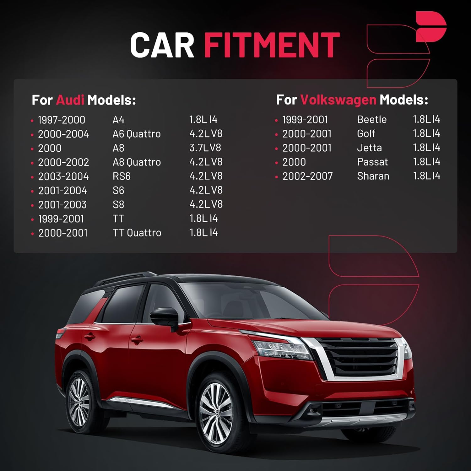 【Compatible with】Please confirm compatibility based on your vehicle's year, brand, model, and the OE number of the replacement coils.Ignition coils Compatible with Audi 97-00 A4, 00-04 A6 Quattro, 2000 A8, 00-02 A8 Quattro, 03-04 RS6, 01-04 S6, 01-03 S8, 99-01 TT, 00-01 TT Quattro; Compatible with VW 99-01 Beetle, 00-01 Golf, 00-01 Jetta, 2000 Passat, 02-07 Sharan. More information can be found in the pictures or on the details page.