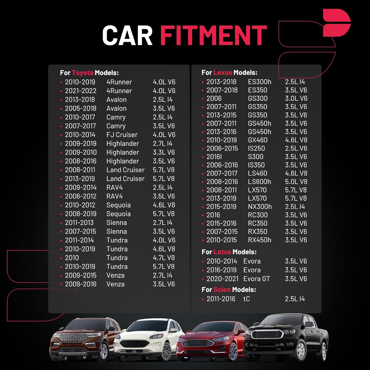 【Ignition Coil Compatible with】Compatible with Lexus ES350 2007-2018, Lexus IS250 2006-2015, Lexus IS350 2006-2016, Lexus RX350 2007-2015; Compatible with Toyota Avalon 2005-2018, Toyota Camry 2007-2017, Toyota RAV4 2006-2014, Toyota Sienna 2007-2015; Compatible with Lotus Evora 2010-2014&2016-2019; Compatible with Scion tC 2011-2016.ect. Please confirm the compatibility according to the year/make/model of your vehicle and the OE number of the replaceable part.