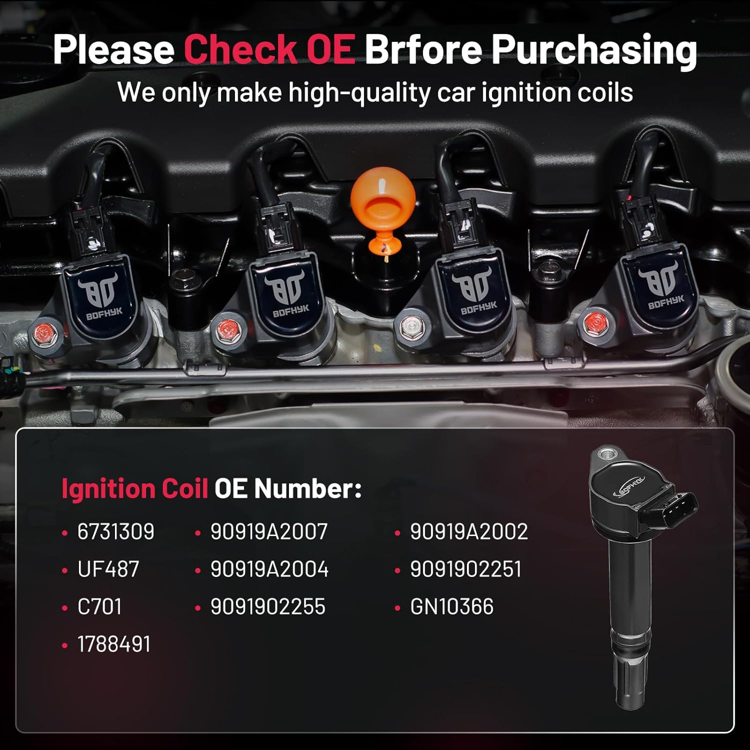 【Compatible OEM Part Numbers:】Coil packs compatible to UF487, UF-487, 6731309, 90919A2007, 90919A2002, 90919A2004, 9091902251, 9091902255, GN10366, 1788491, C701.