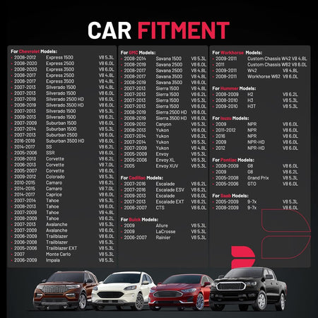 【Compatible with】Chevrolet Express 1500 2500 3500, Silverado 2500 3500 HD, Corvette, SS, Tahoe, Colorado, Camaro, Caprice, Suburban 1500 2500, Impala, Monte Carlo, SSR, Compatible with GMC Sierra 2500 3500 HD, Savana 2500 3500, Canyon, Yukon, Envoy, Compatible with Buick Allure, LaCrosse, Rainier, Compatible with Cadillac Escalade ESV, CTS.More information can be found in the pictures or on the details page.
