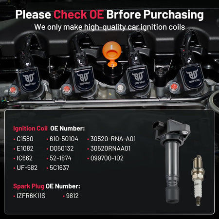 【Coils Features】Coil packs are made of Japan-imported rubber and Germany-imported varnished wire,and the exquisite craftsmanship design makes our products durable even under extreme conditions.OE No.30520-RNA-A01, 30520RNAA01, UF-582, C1580, 099700-102, DQ50132, 610-50104, 5C1637, E1082, 52-1874, IC662.