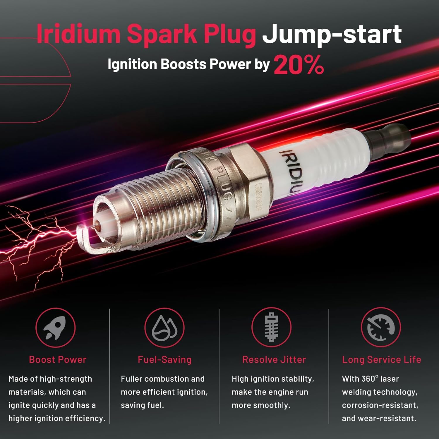 【Spark Plug Features】spark plugs are made of iridium electrodes and hydrostatic ceramics, and are hot riveted to give them superior ignition performance and a longer service life, ensuring that your car will take on a new lease of life after installation.OE No.IZFR6K11S, 9812.