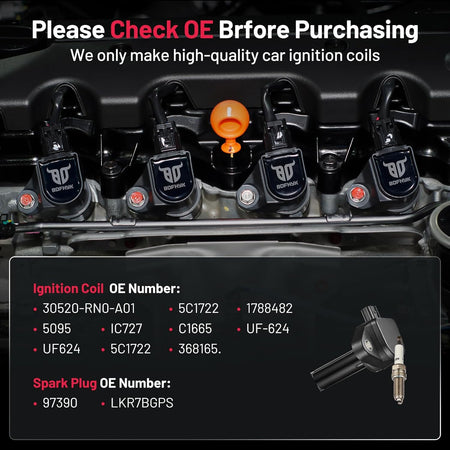 【Coils Features】Coil packs are made of Japan-imported rubber and Germany-imported varnished wire,and the exquisite craftsmanship design makes our products durable even under extreme conditions.OE No.30520-RN0-A01, 5C1722, 1788482, 5095, IC727, C1665, UF-624, UF624, 5C1722, 368165.