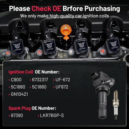 【Coils Features】Coil packs are made of Japan-imported rubber and Germany-imported varnished wire,and the exquisite craftsmanship design makes our products durable even under extreme conditions.OE No.C900, 5C1880, GN10421, 6732317, 5C1880, UF-672, UF672.