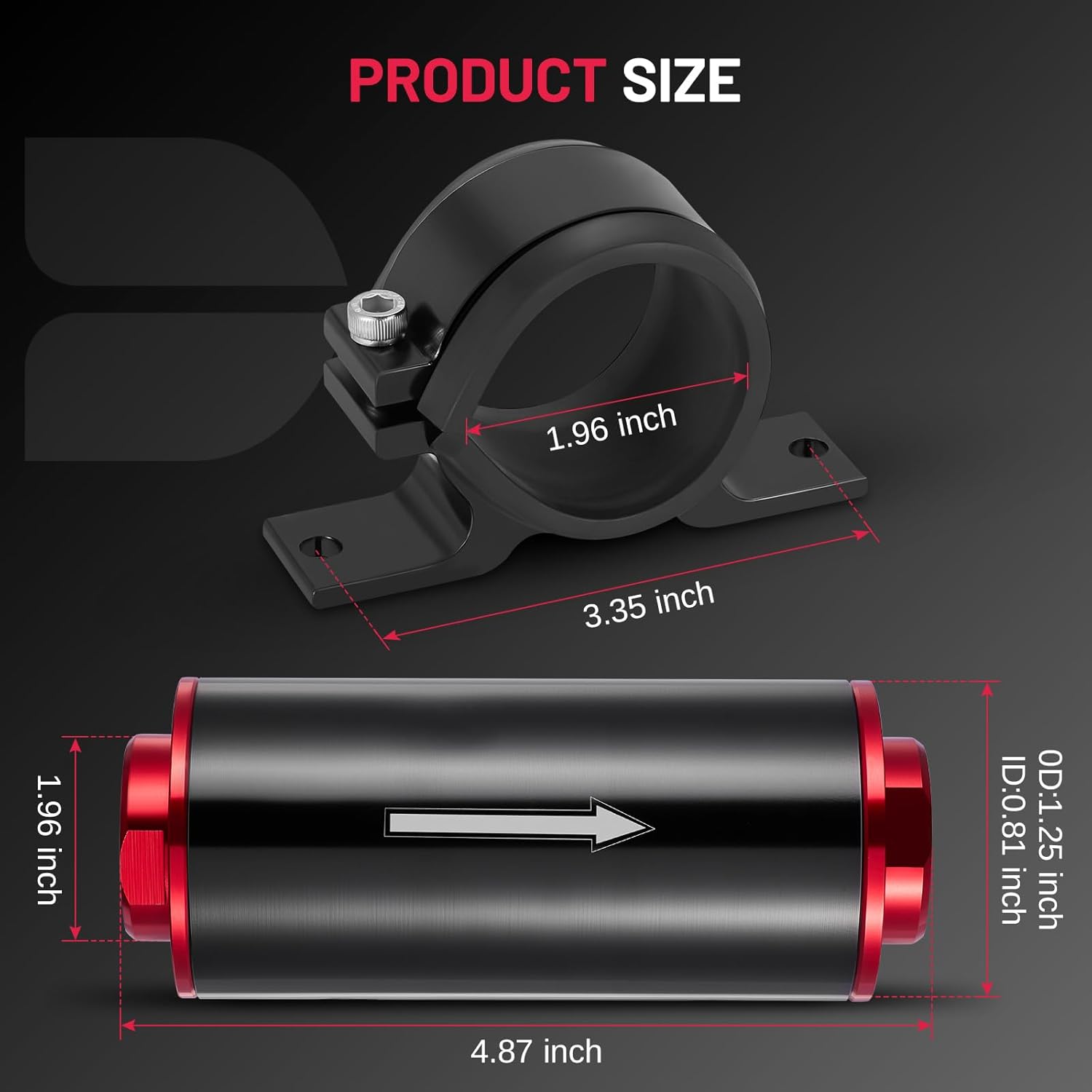 Durable Construction: This inline fuel filter is made of T-6061 high-quality aluminum alloy, and its filter is made of stainless steel, which is easy to remove and clean. Its durable structure prolongs its lifespan, providing a reliable solution for your fuel filtration needs