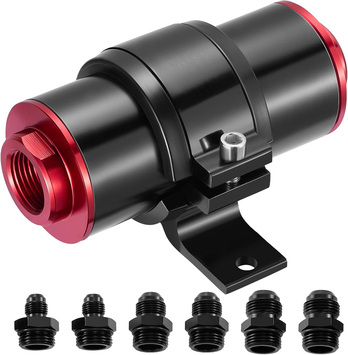 Universal Compatibility: This fuel filter is compatible with gasoline, diesel, and E85 fuels. It includes AN6, AN8, and AN10 adapters, ensuring a versatile fit for various fuel system sizes in different vehicles