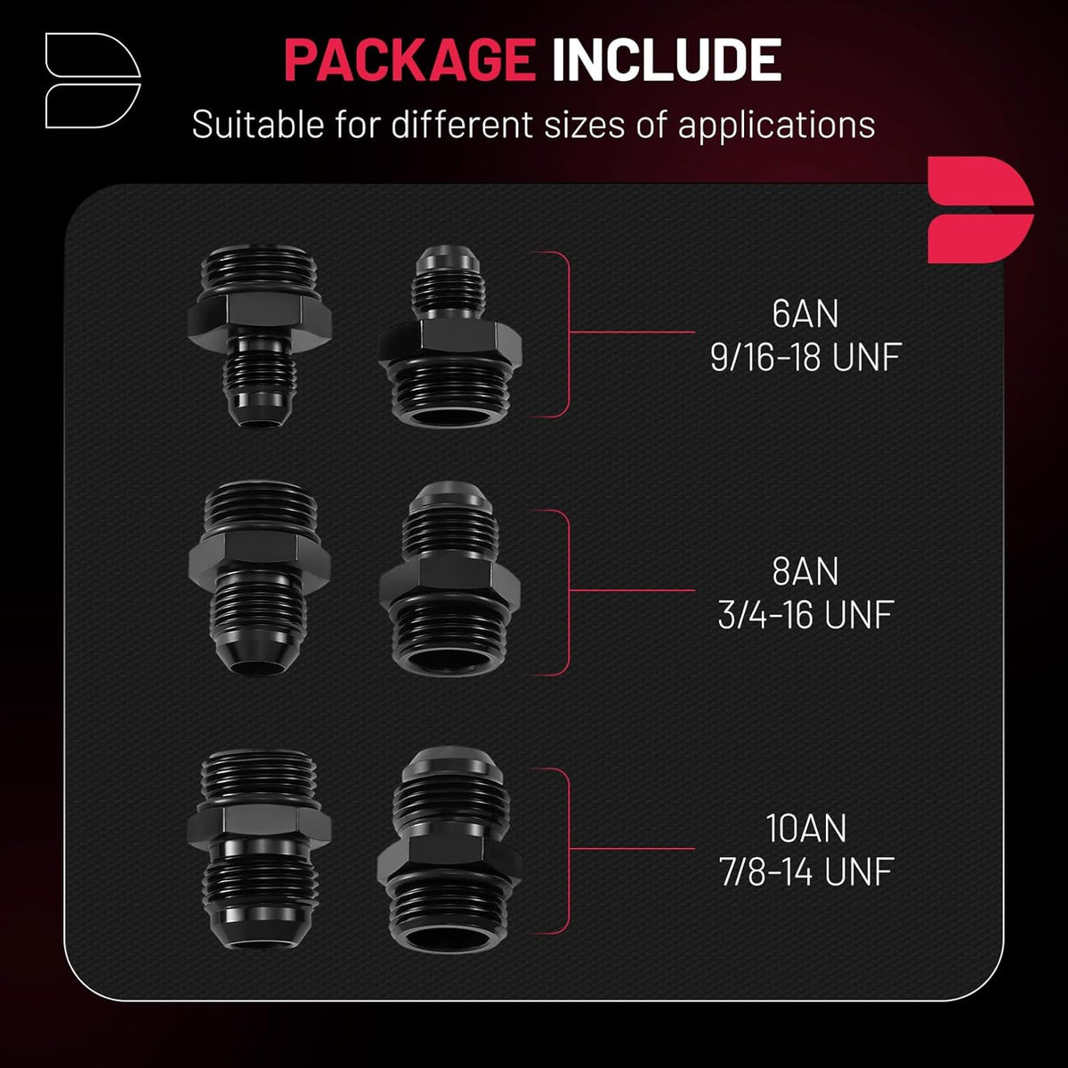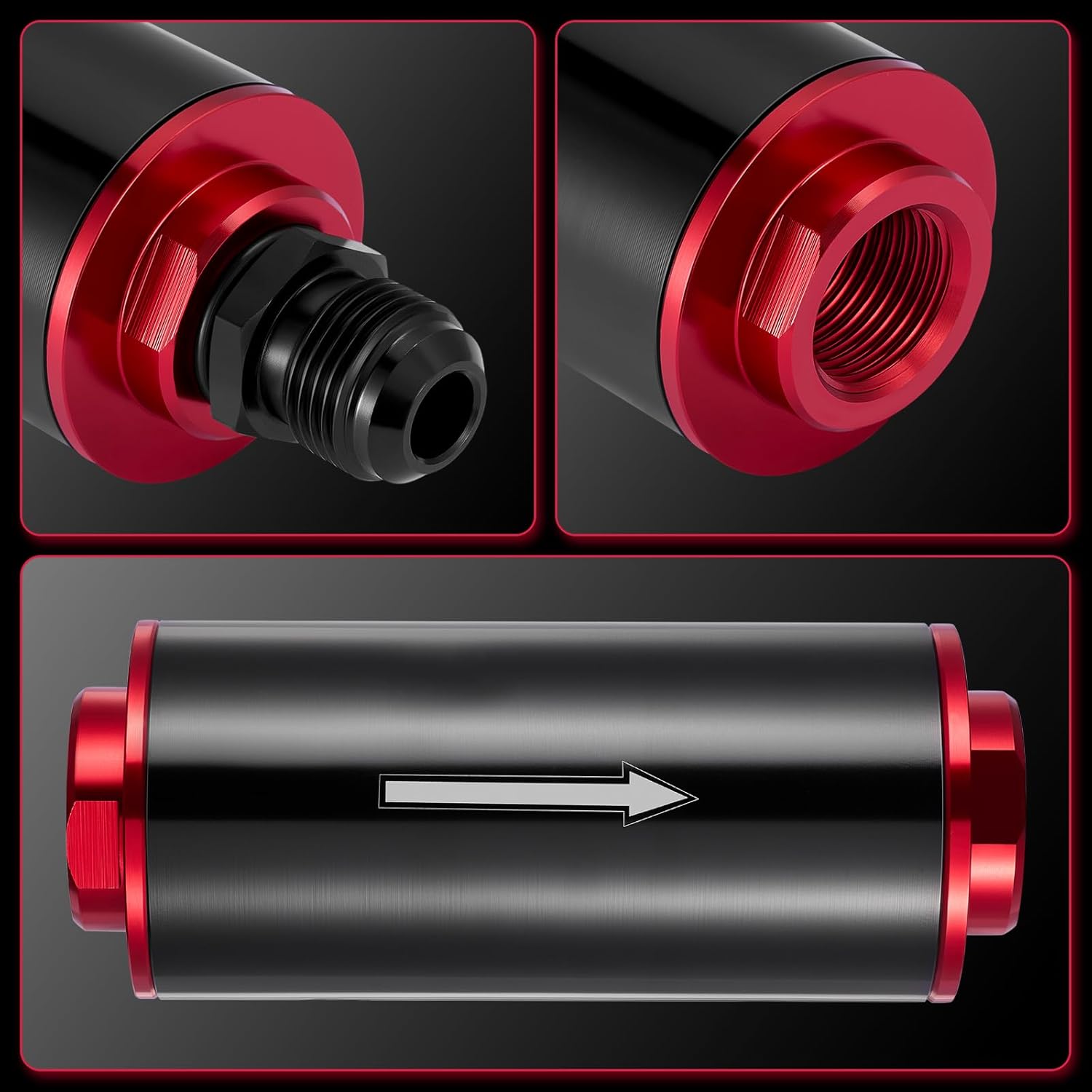 Product Specifications: Product diameter: 50mm; Product length: 4.19 inches; Thread specification on filter: 10AN(7/8-14 UNF); Connector thread specification: 6AN(9/16-18 UNF)8AN(3/4-16 UNF)10AN(7/8-14 UNF); Filter: 100 microns (captures particles larger than 100 microns)generally used in front of the fuel pump; Color: Black & Red