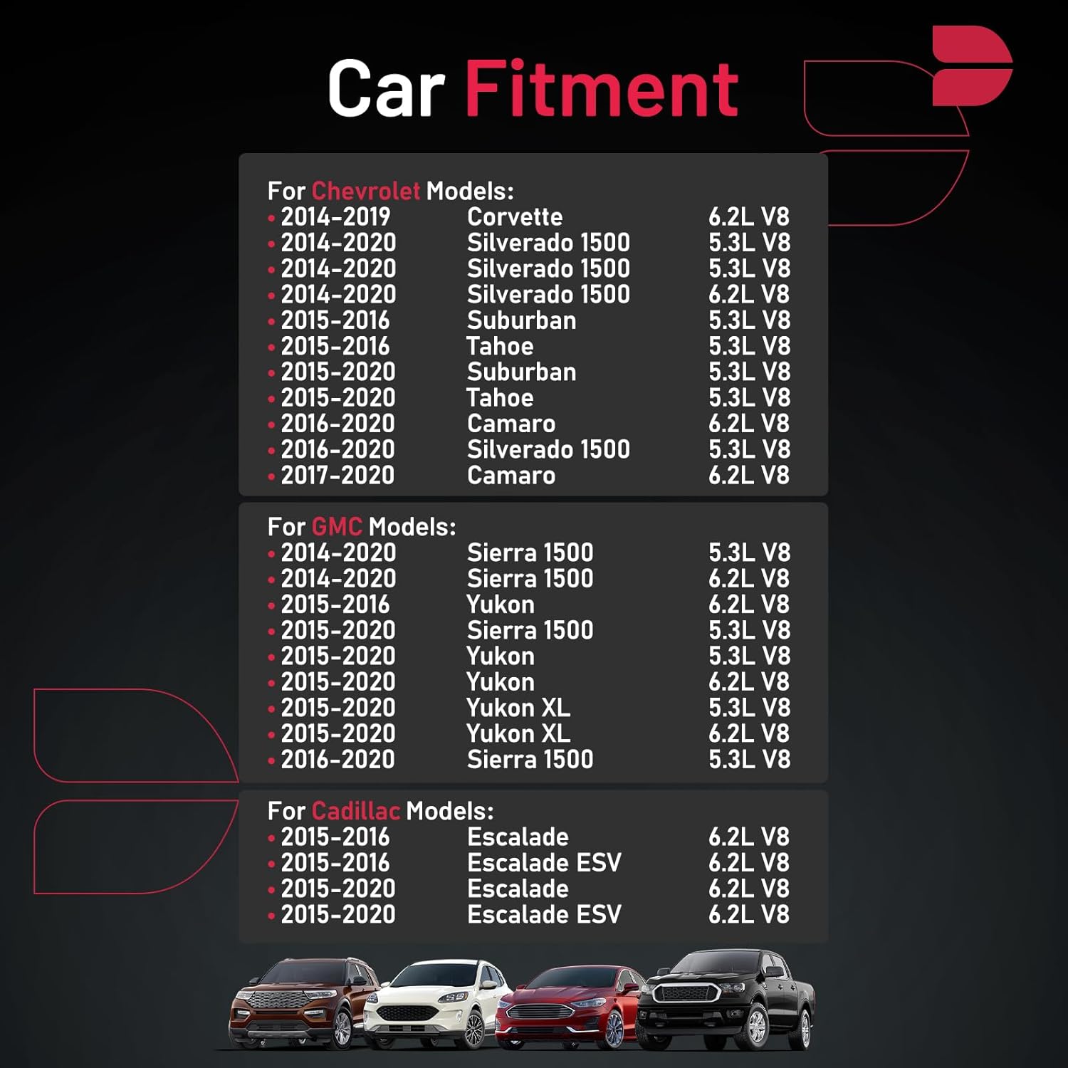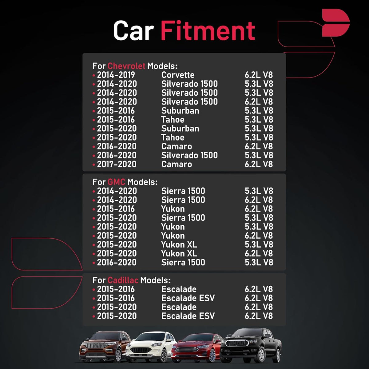 【Compatible Vehicle Information】Spark plug Compatible with Cadillac 2015-2020 Escalade, 2015-2020 Escalade ESV; Compatible with Chevrolet 2016-2020 Camaro, 2014-2019 Corvette, 2014-2020 Silverado 1500, 2015-2020 Suburban,2015-2020 Tahoe; Compatible with GMC 2014-2020 Sierra 1500, 2015-2020 Yukon, 2015-2020 Yukon XL. For more information, please check the pictures or the item detail page.