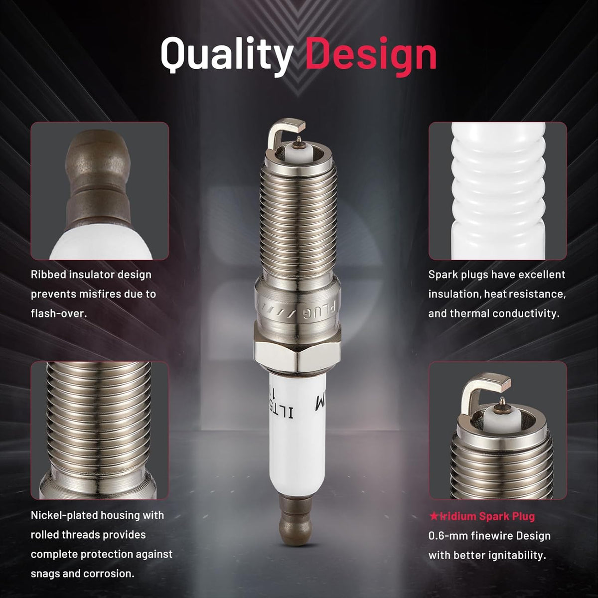 【With higher performance】The center electrode of the spark plug is made of extremely fine iridium electrode, which better concentrates the spark energy and provides good ignition performance for the vehicle. A copper core is embedded in the center electrode to improve the heat dissipation performance of the vehicle. The insulator is made of isostatically pressed ceramic, which has high strength thermal resistance and good insulation.