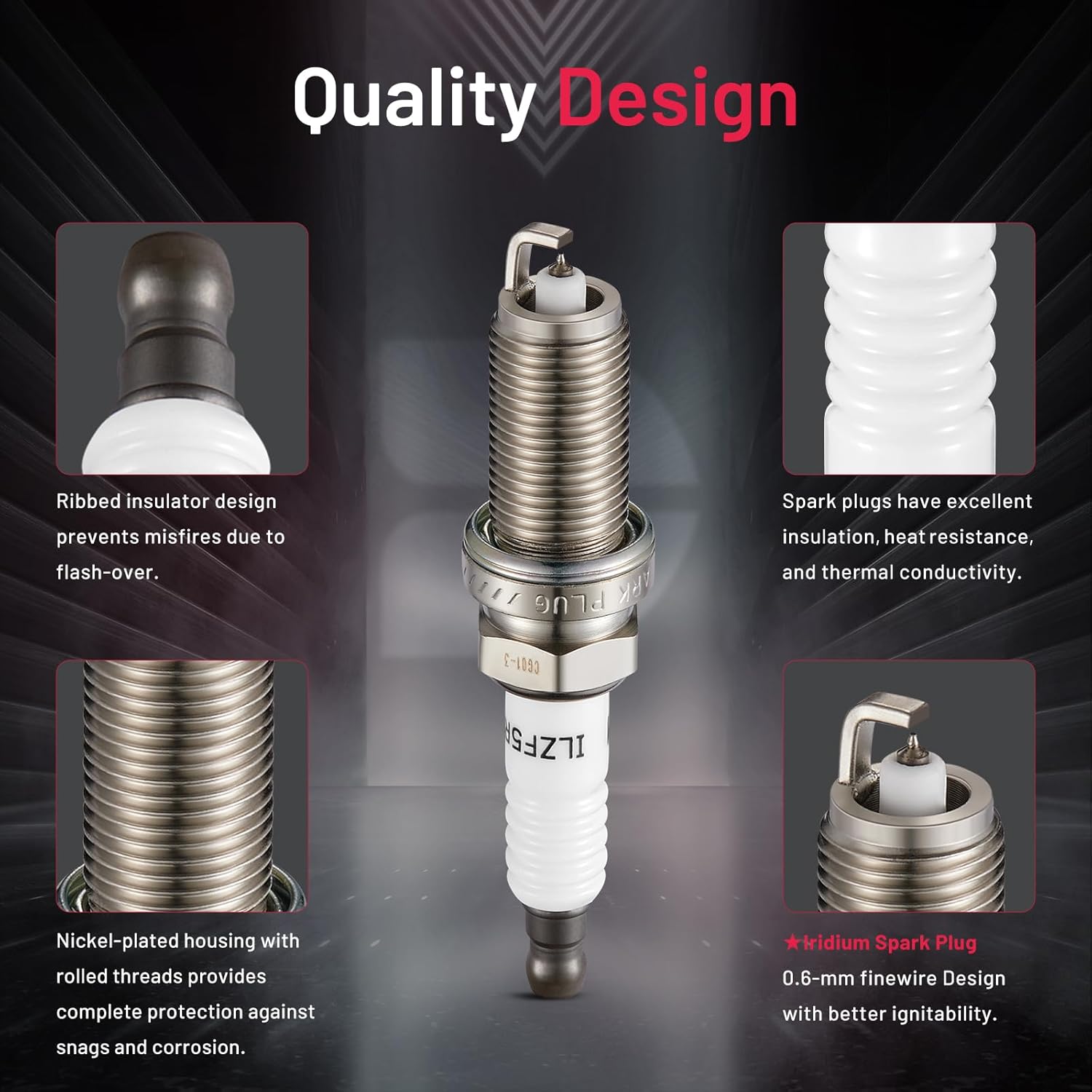 【With higher performance】The center electrode of the spark plug is made of extremely fine iridium electrode, which better concentrates the spark energy and provides good ignition performance for the vehicle. A copper core is embedded in the center electrode to improve the heat dissipation performance of the vehicle. The insulator is made of isostatically pressed ceramic, which has high strength thermal resistance and good insulation.