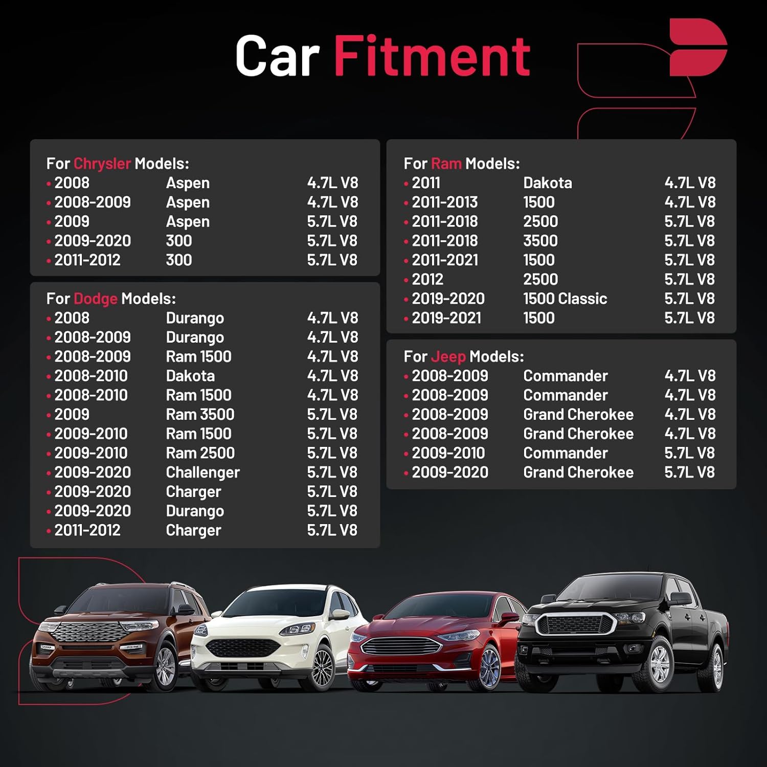 【Compatible Vehicle Information】Spark plug Compatible with Ram 2011-2018 2500 3500, 2011-2021 1500, 2019-2020 1500 Classic, 2011 Dakota; Compatible with Jeep 2008-2020 Grand Cherokee, 2008-2010 Commander; Compatible with Dodge 2008-2020 Durango, 2008-2010 Ram 1500, 2009-2010 Ram 2500, 2009 Ram 3500, 2008-2010 Dakota, 2009-2020 Charger Challenger; Compatible with Chrysler 2009-2020 300, 2008-2009 Aspen. For more information, please check the pictures or the item detail page.