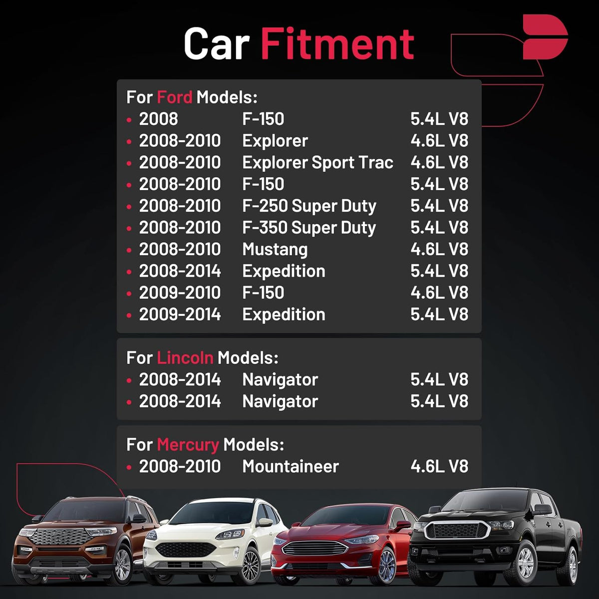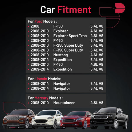 【Compatible Vehicle Information】Spark plug Compatible with 2008-2014 Expedition, 2008-2010 Explorer, 2008-2010 Mustang, 2008-2010 F-150, 2008-2010 F-250 Super Duty, 2008-2010 F-350 Super Duty, 2008-2010 Explorer Sport Trac; Compatible with Mercury 2008-2010 Mountaineer; Compatible with Lincoln 2008-2014 Navigator. For more information, please check the pictures or the item detail page.