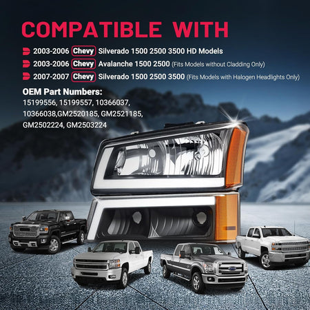 Vehicle Compatibility: Our LED headlights assembly compatible with2003-2006 Chevy Silverado 1500 2500 3500 HD Models, 2003-2006 Chevy Avalanche 1500 2500(Fits Models without Cladding Only), 2007 Silverado 1500 2500 3500(Fits Models with Halogen Headlights Only).Reference part number: 15199556, 15199557, 10366037, 10366038,GM2520185, GM2521185, GM2502224, GM2503224