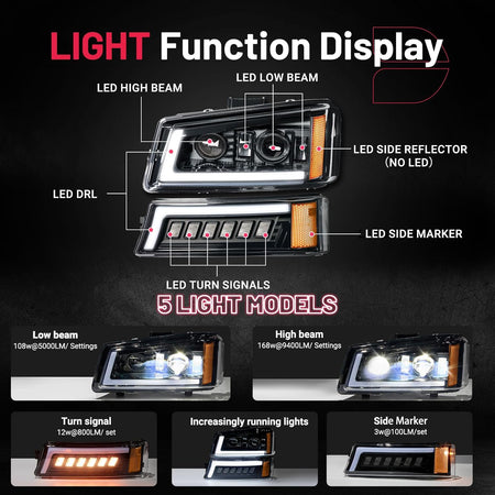 Integrated LED Headlights Assembly: All-in-one creative visual design with 5 practical lighting functions - high beam, low beam, turn signal, side marker and DRL. High beam: 168W@9400lm/set, low beam: 108W@5000lm/set provides you with 600% brighter than stock halogen and 4 times brighter than other ordinary LED bulbs.