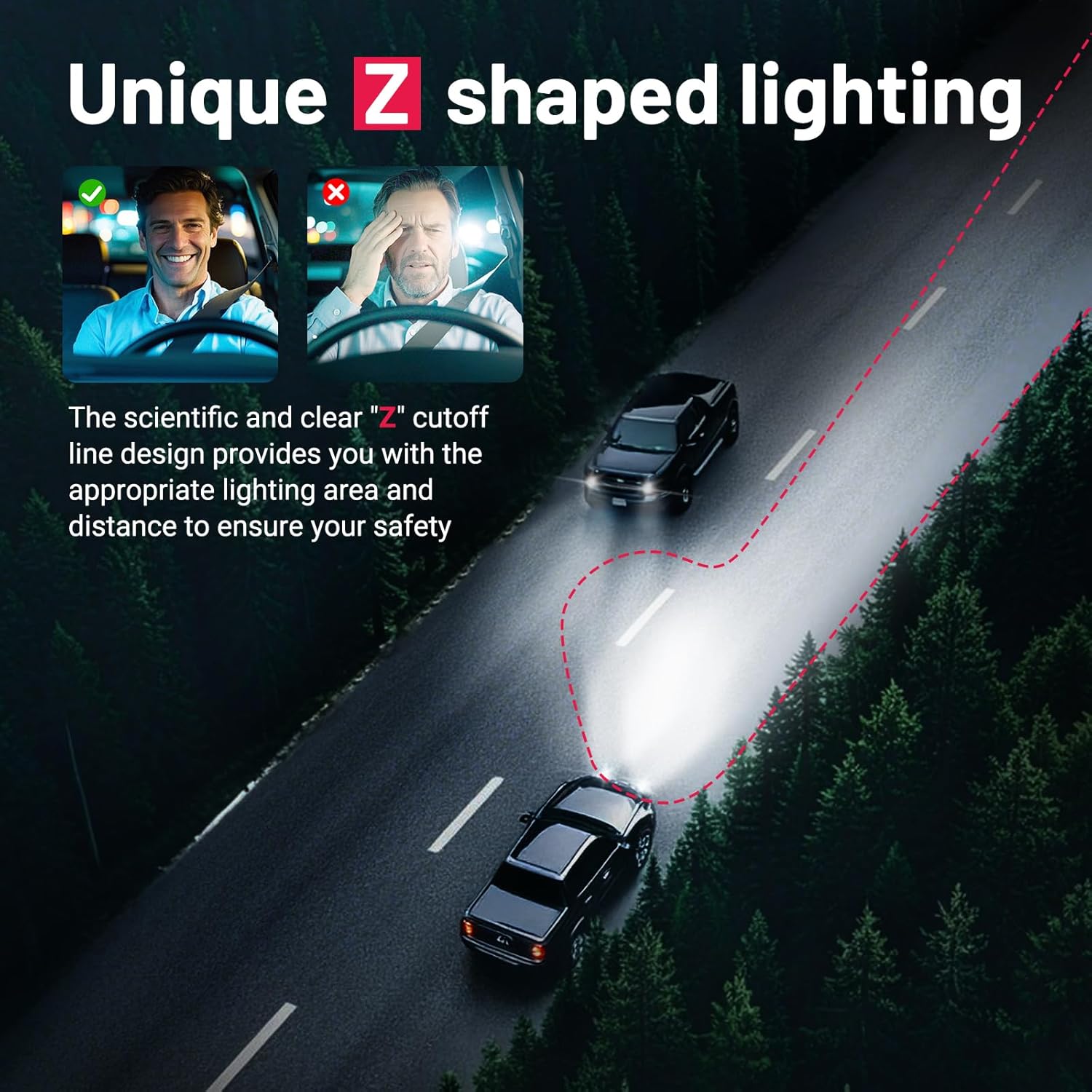 Exclusive "Z" Beam Pattern: Our LED headlight design adopts a scientific and clear "Z" cut-off line design, providing you with the appropriate lighting area and distance, which will not blind oncoming traffic to ensure your safety.