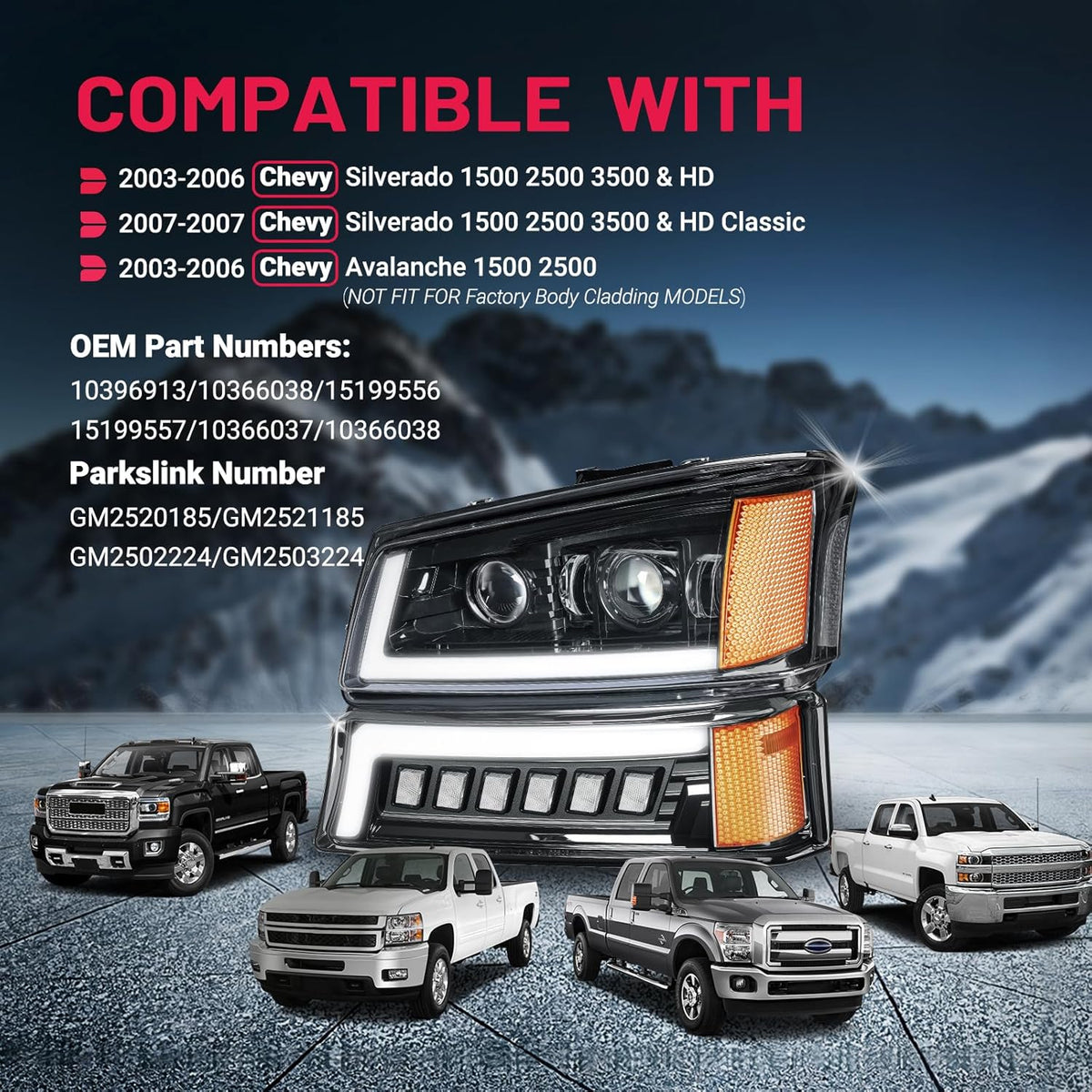 Compatibility: LED headlight assemblies are compatible with 03-06 Chevy Silverado 1500 2500 3500 & HD; 07 Silverado 1500 2500 3500 & HD Classic; 03-06 Chevy Avalanche 1500 2500 (except Factory Body Cladding). OEM Part Numbers: 10396913, 10366038, 15199556 15199557 10366037 10366038;Parkslink Number: GM2520185 GM2521185 GM2502224 GM2503224.