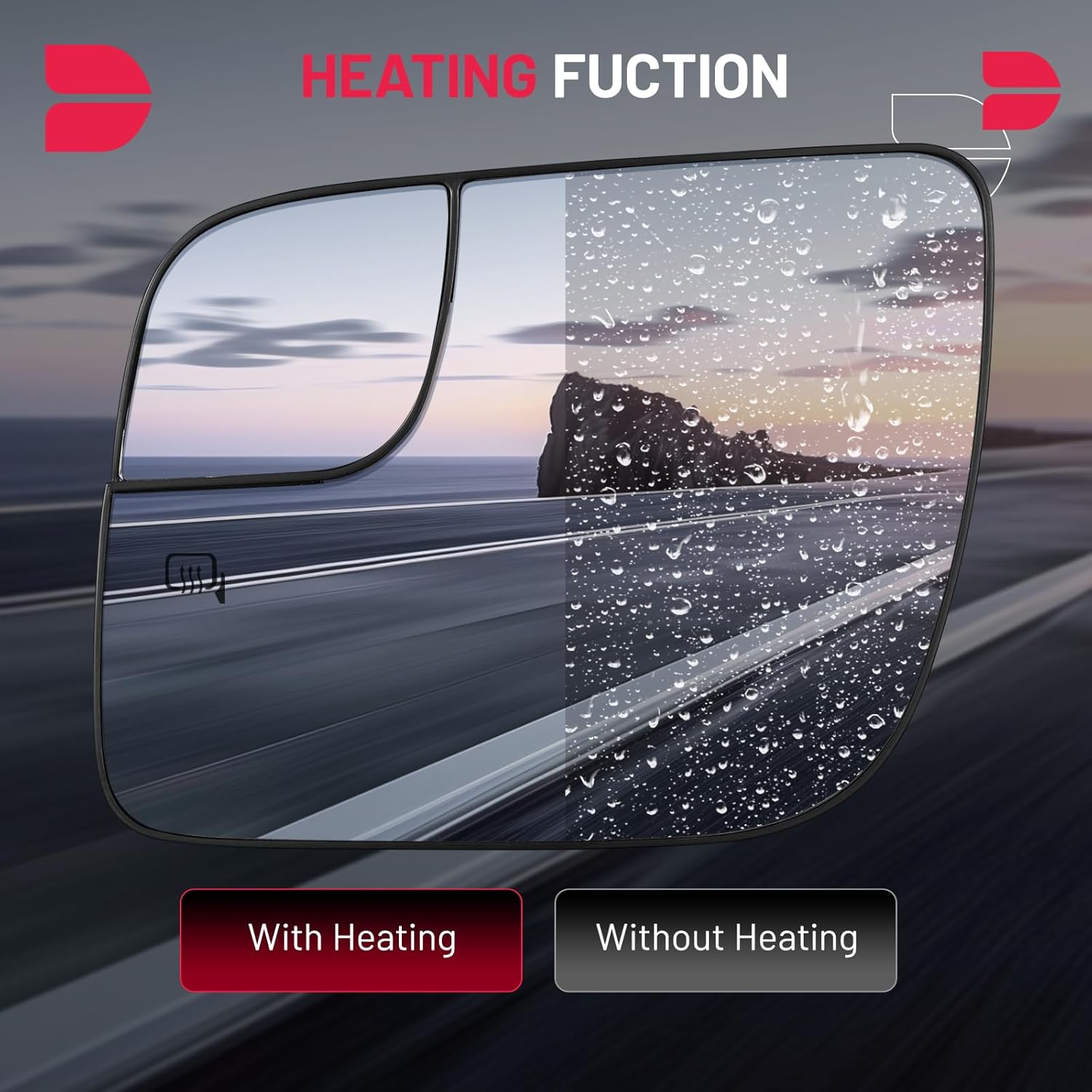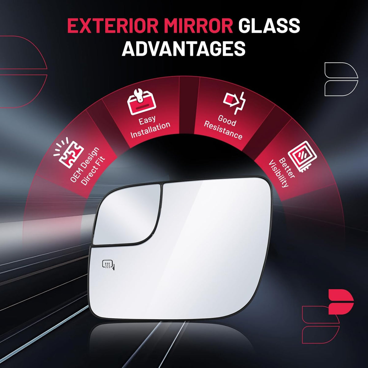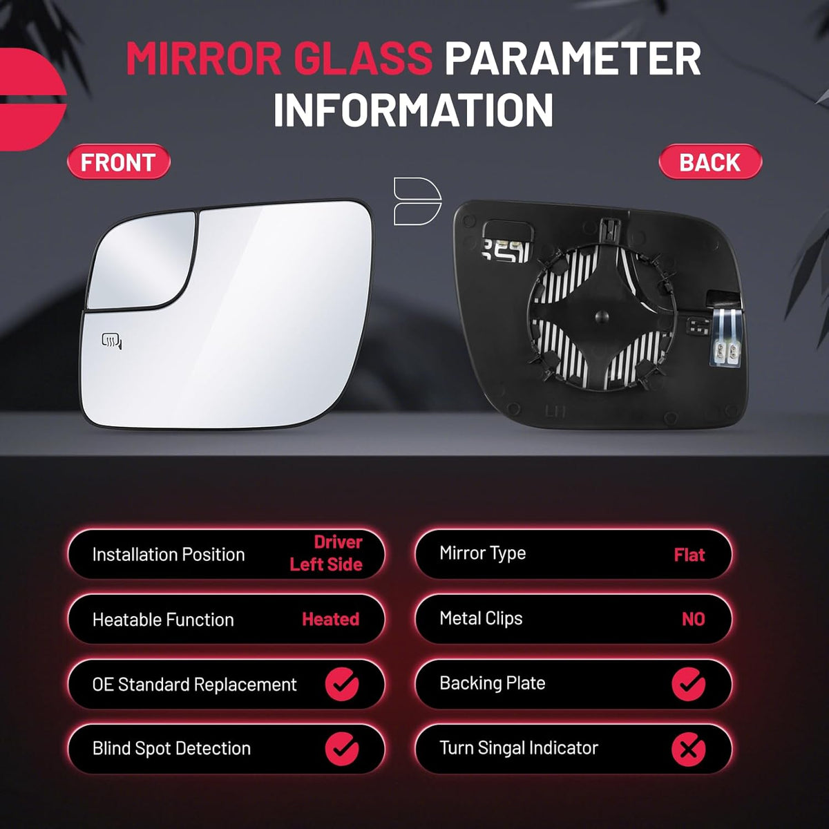 【PACKAGE INCLUDE】Includes 1 PCS driver left side flat mirror glass. Identical mounting point with factory mirror, perfectly fit with the existing electrical wiring. Wiring harness must be unplugged from existing backing plate and plugged into the new backing plate before installation. You can complete the installation in a few minutes.