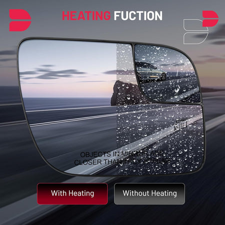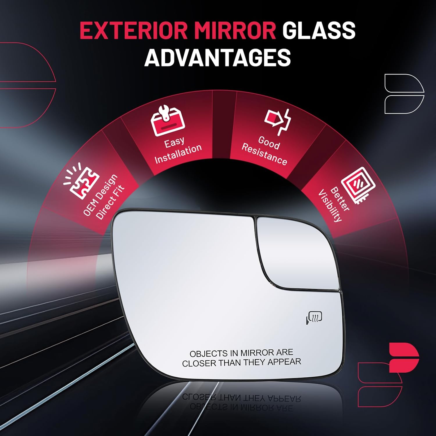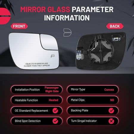 【PACKAGE INCLUDE】Includes 1 PCS Passenger Right side convex mirror glass. Identical mounting point with factory mirror, perfectly fit with the existing electrical wiring. Wiring harness must be unplugged from existing backing plate and plugged into the new backing plate before installation. You can complete the installation in a few minutes.