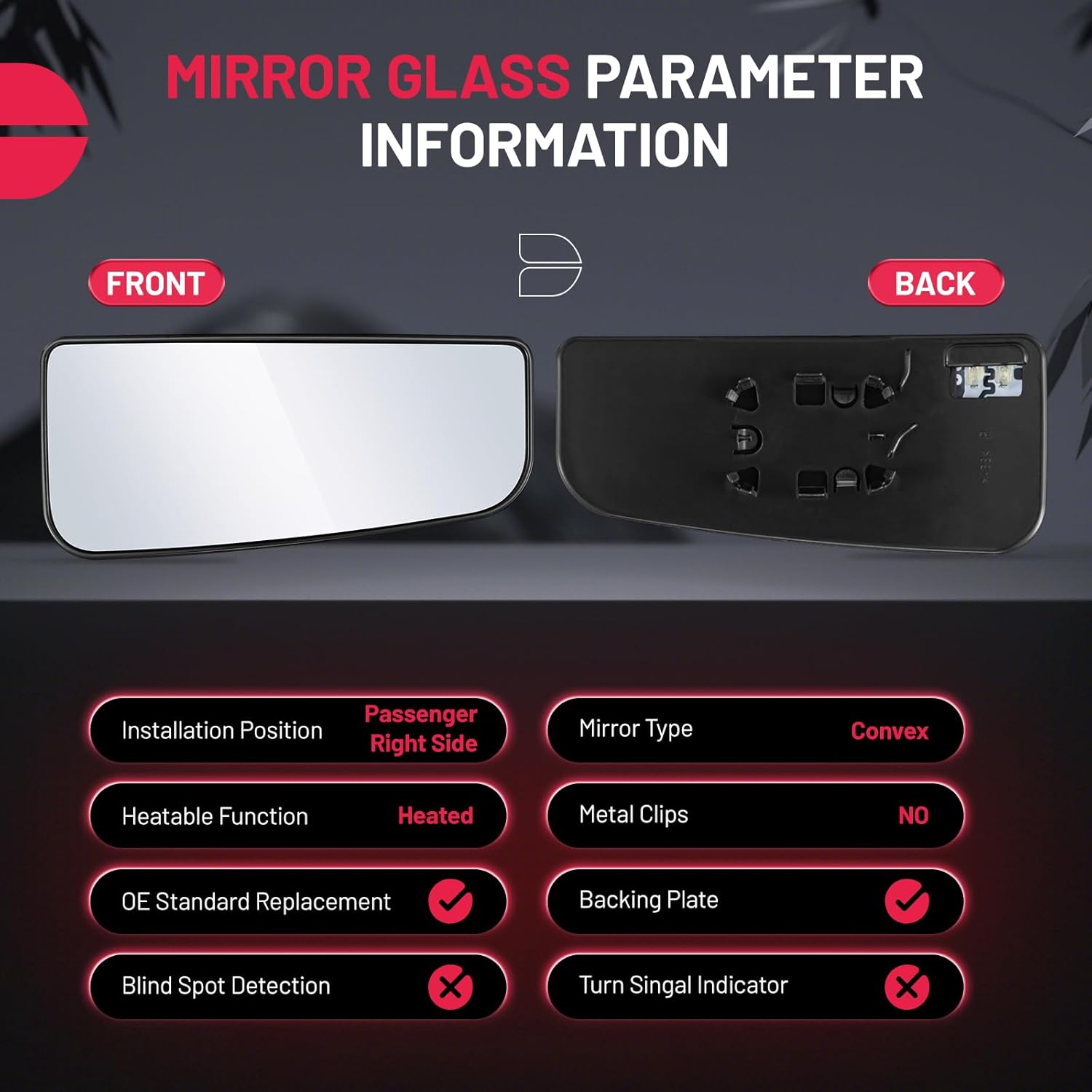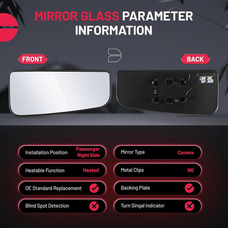 【PACKAGE INCLUDE】Includes 1 PCS Passenger Right side convex mirror glass. Identical mounting point with factory mirror, perfectly fit with the existing electrical wiring. Wiring harness must be unplugged from existing backing plate and plugged into the new backing plate before installation. You can complete the installation in a few minutes.