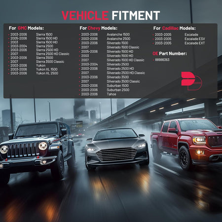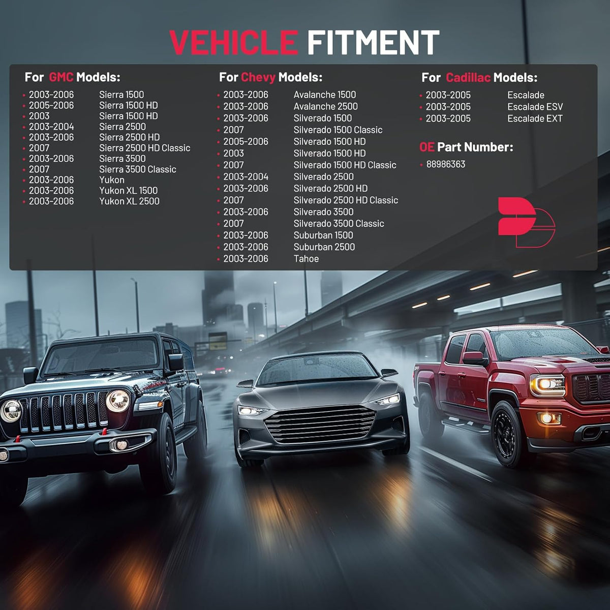 【COMPATIBILITY】Compatible with Chevy 1999-2006 Silverado 1500 2500, 2001-2006 Silverado 3500, 2000-2006 Tahoe Suburban 1500 2500, 2002-2006 Avalanche 1500 2500; Compatible with GMC 1999-2006 Sierra 1500, 1999-2004 Sierra 2500, 2001-2006 Sierra 3500; Compatible with Cadillac 2002-2006 Escalade. Position: Right (Passenger Side). Please confirm the compatibility according to the year/make/model of your vehicle and the OE number of the replaceable part.