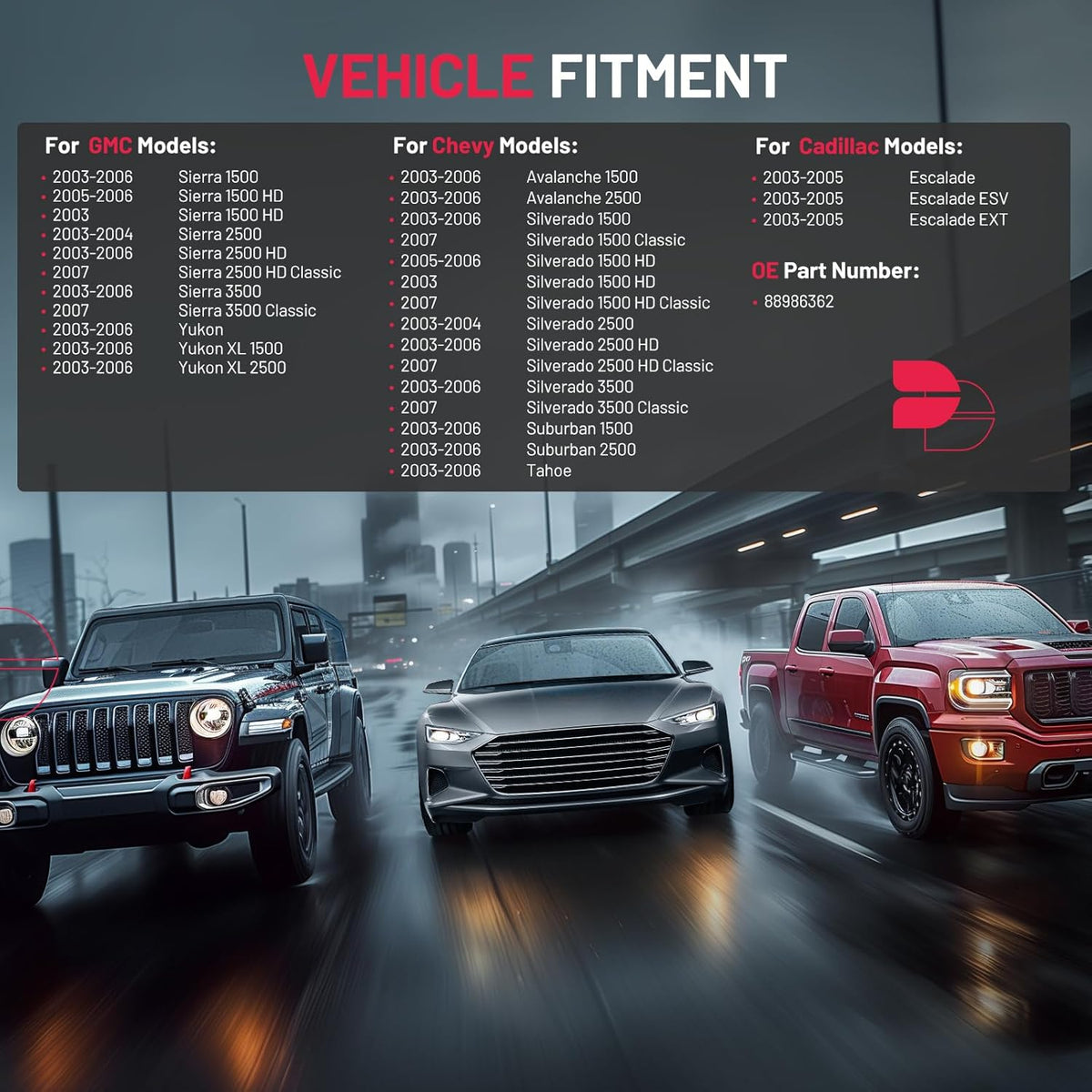 【COMPATIBILITY】Compatible with Chevy 1999-2006 Silverado 1500 2500, 2001-2006 Silverado 3500, 2000-2006 Tahoe Suburban 1500 2500, 2002-2006 Avalanche 1500 2500; Compatible with GMC 1999-2006 Sierra 1500, 1999-2004 Sierra 2500, 2001-2006 Sierra 3500; Compatible with Cadillac 2002-2006 Escalade. Position: Left (Driver Side). Please confirm the compatibility according to the year/make/model of your vehicle and the OE number of the replaceable part.