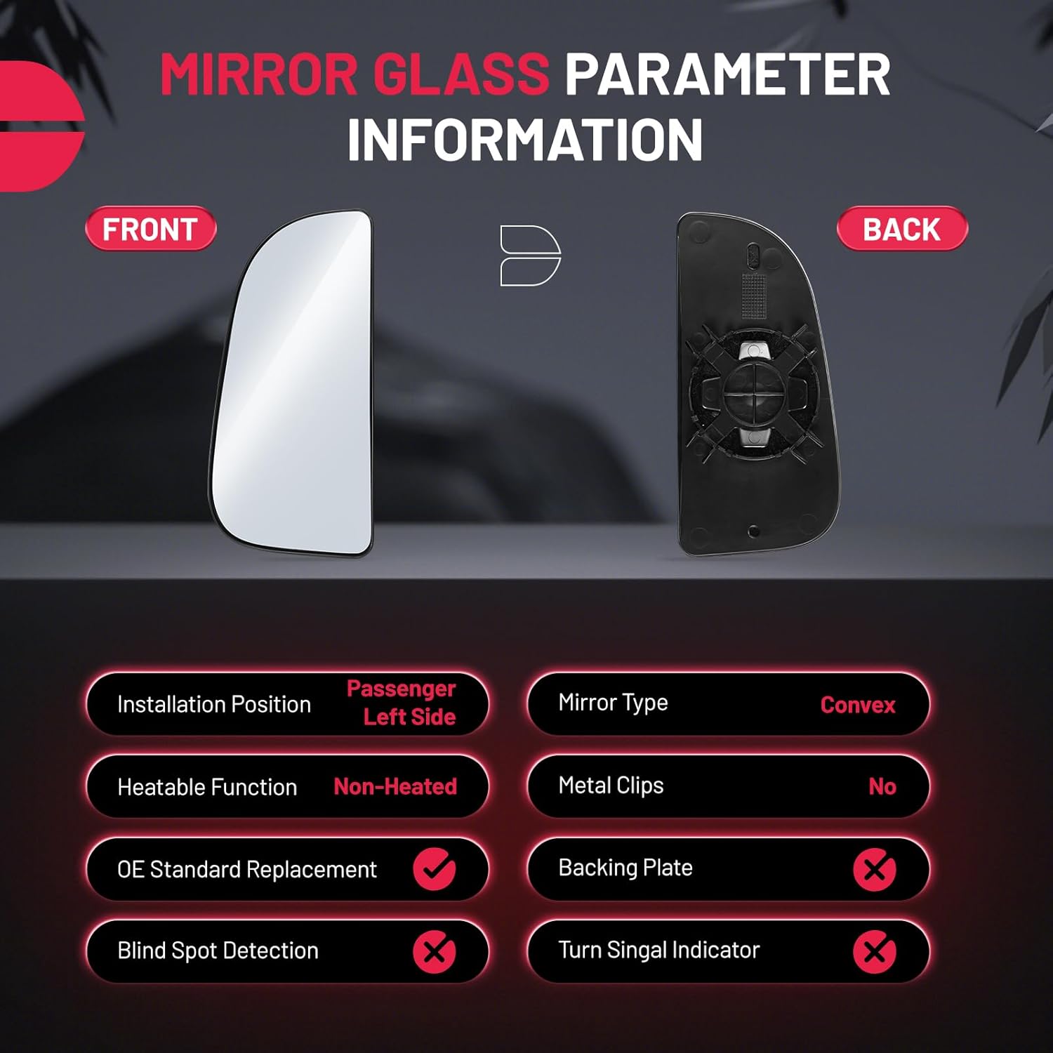 【PACKAGE INCLUDE】Includes 1 PCS left side convex mirror glass with rear holder. Identical mounting point with factory mirror, you can complete the installation in a few minutes.