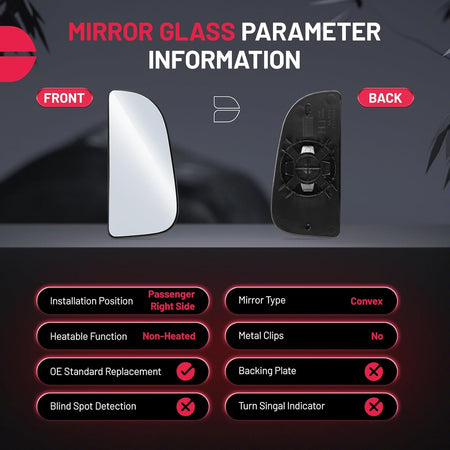 【PACKAGE INCLUDE】Includes 1 PCS right side convex mirror glass with rear holder. Identical mounting point with factory mirror, you can complete the installation in a few minutes.
