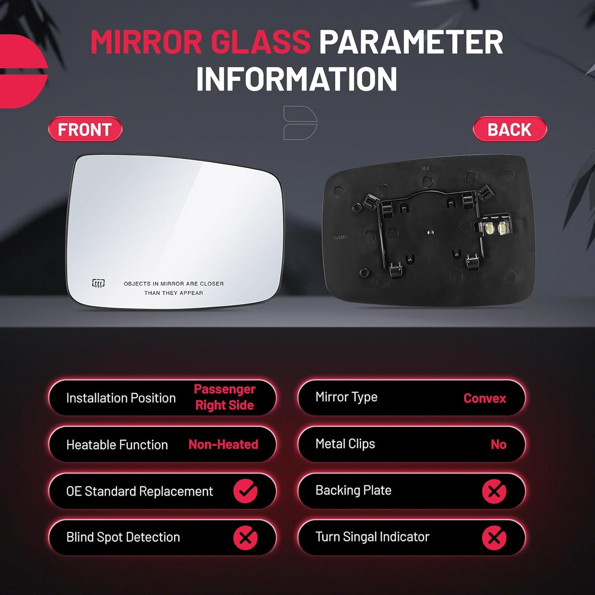 【PACKAGE INCLUDE】Includes 1 PCS passenger right side mirror glass. Come with two metal clips, plug and play, identical mounting point with factory mirror, perfectly fit with the existing electrical wiring. Wiring harness must be unplugged from existing backing plate and plugged into the new backing plate before installation. You can complete the installation in a few minutes.