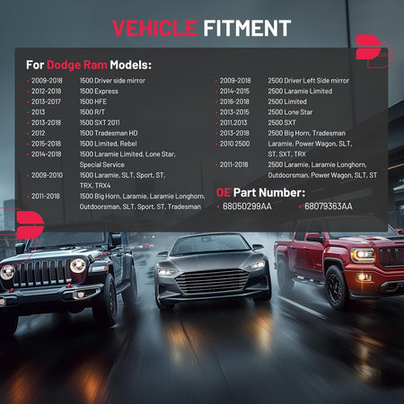 【REPLACES PART】Replacement for Dodge Ram Right Side Mirror OE Number: 68050298AA, 68079362AA. This righ side convex mirror with heated function, keeping ice and fog off side view mirrors, more easily see vehicles and other dangers when weather conditions are inclement.