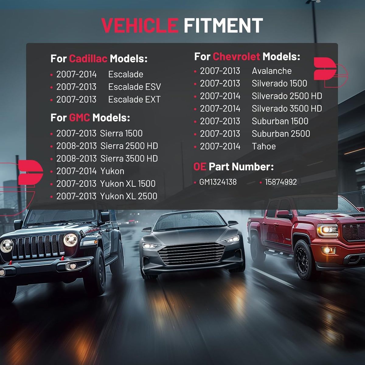 【COMPATIBILITY】Compatible with Cadillac 07-14 Escalade,07-13 Escalade ESV EXT; Compatible with Chevy 07-13 Avalanche Silverado 1500, 07-14 Silverado 2500 HD 3500 HD, 07-13 Suburban 1500 2500, 07-14 Tahoe; Compatible with GMC 07-13 Sierra 1500, 08-13 Sierra 2500 HD 3500 HD,07-14 GMC Yukon, 07-13 Yukon XL 1500 2500. Please make sure your car model and part number GM1324138, 15874992
