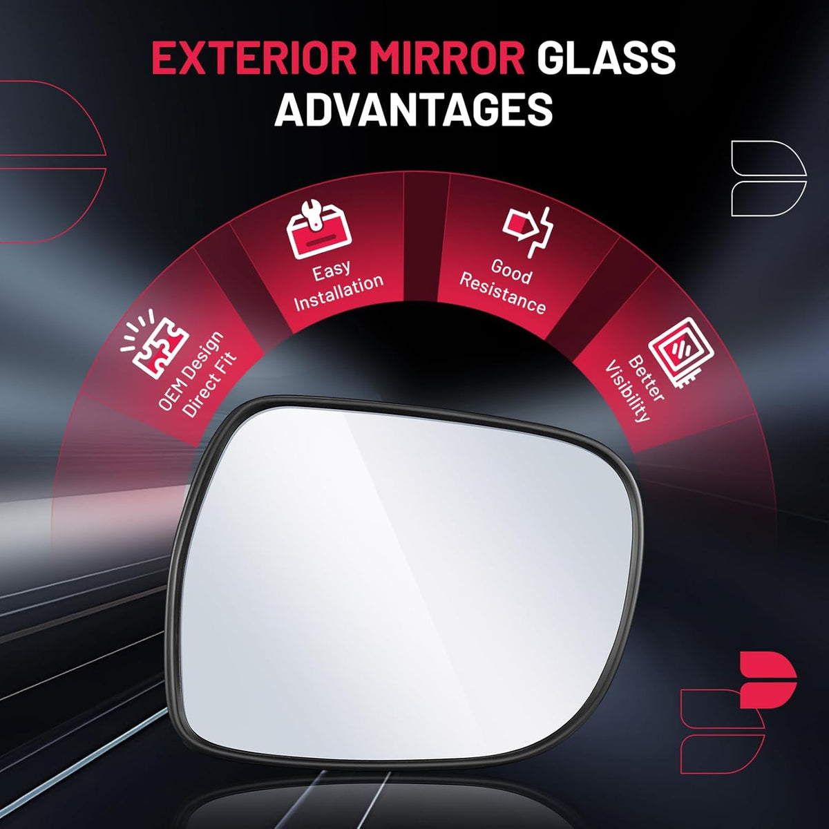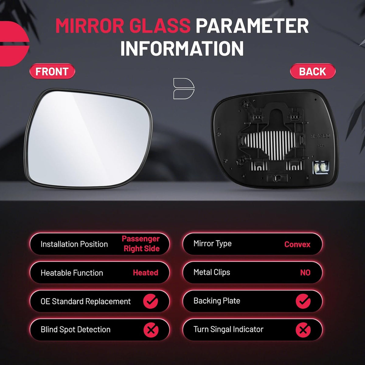 【PACKAGE INCLUDE】Includes 1 PCS Passenger Right side convex mirror glass. Identical mounting point with factory mirror, perfectly fit with the existing electrical wiring. Wiring harness must be unplugged from existing backing plate and plugged into the new backing plate before installation. You can complete the installation in a few minutes.
