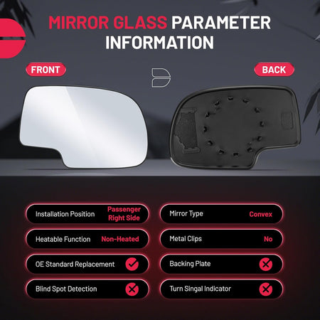 【PACKAGE INCLUDE】Includes 1 PCS right side convex mirror glass with rear holder. Identical mounting point with factory mirror, you can complete the installation in a few minutes.