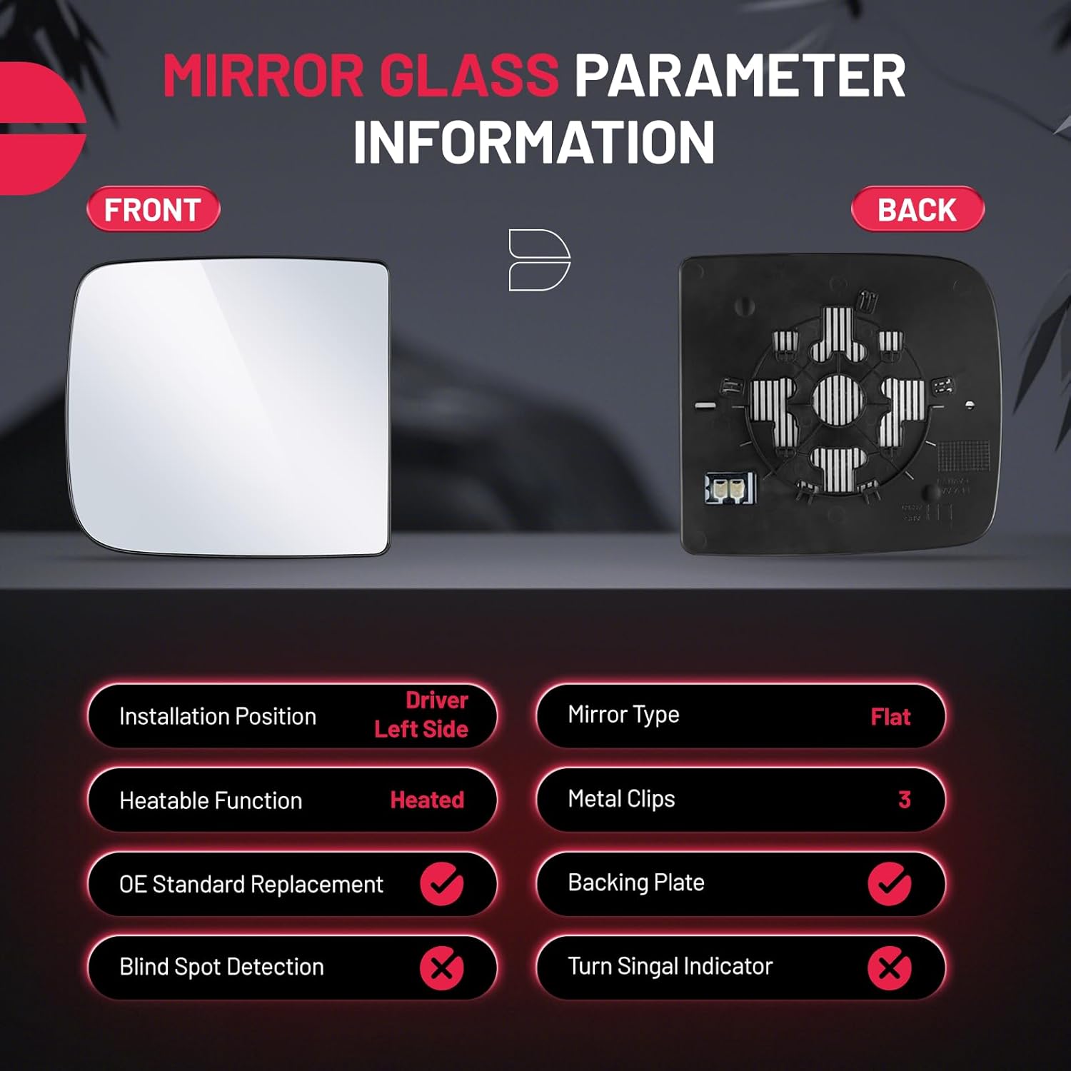 [Package Include] Package includes 1 piece of flat mirror glass for the driver (left) side. Comes with three metal clips for secure attachment. Designed for plug-and-play installation with identical mounting points as the original mirror, Installation takes only a few minutes no special tools required.