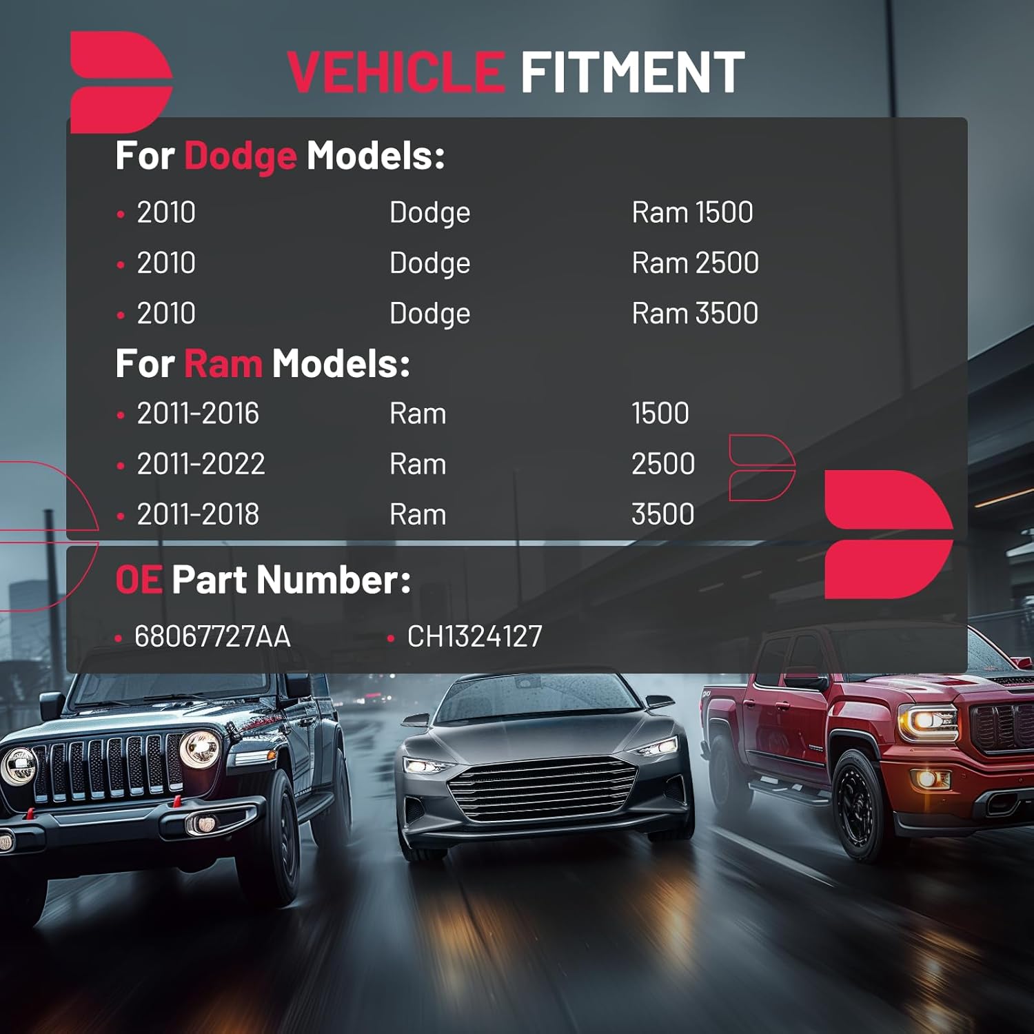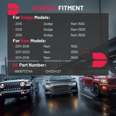 [Compatibility] Compatible with Dodge Ram 1500 2010 , Compatible with Dodge Ram 2500 2010 ,Compatible with Dodge Ram 3500 2010, Compatible with Ram 1500 2011-2016, Compatible with Ram 2500 2011-2022, Compatible with Ram 3500 2011-2018. Before purchasing, please verify your vehicle’s model and the part number to ensure proper fitment.