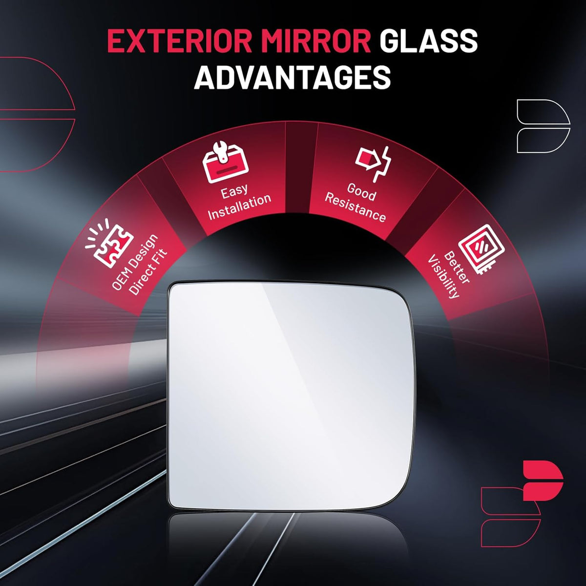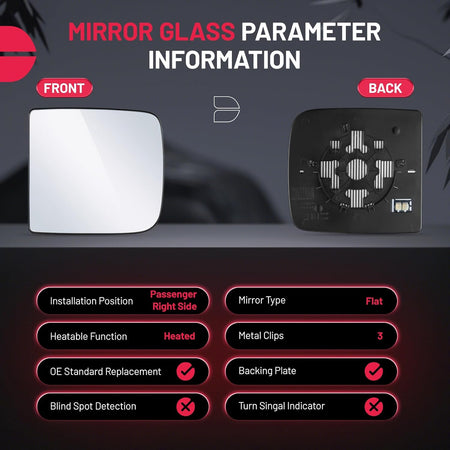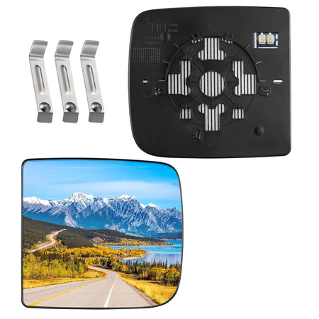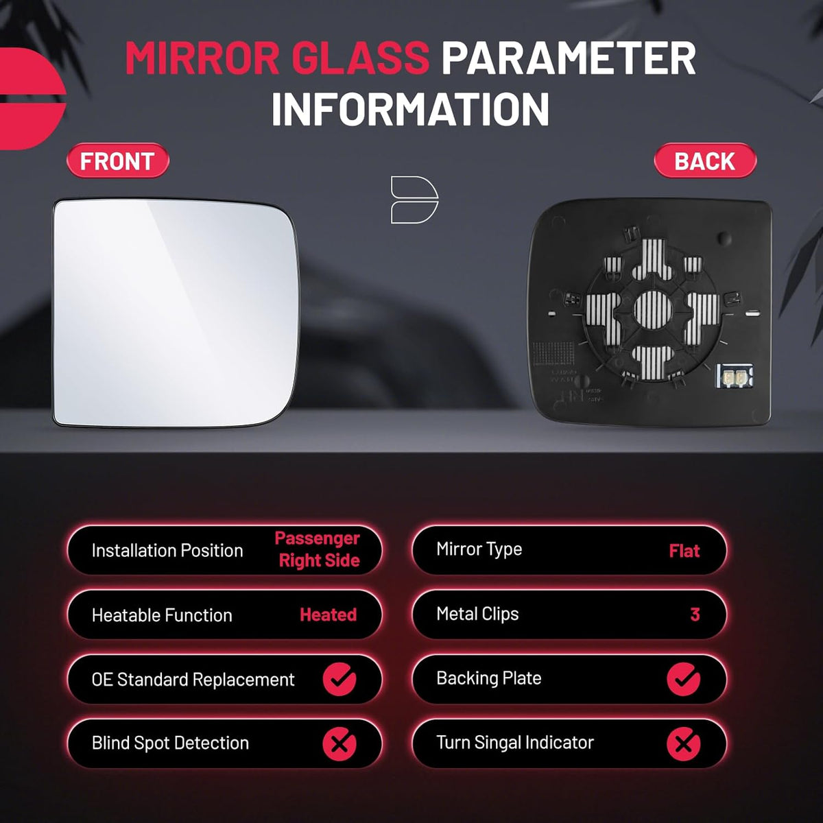 [Package Include] Includes 1 PCS Right side flat mirror glass. Come with three metal clips, plug and play, identical mounting point with factory mirror, perfectly fit with the existing electrical wiring. Designed for plug-and-play installation with identical mounting points as the original mirror, Installation takes only a few minutes no special tools required.