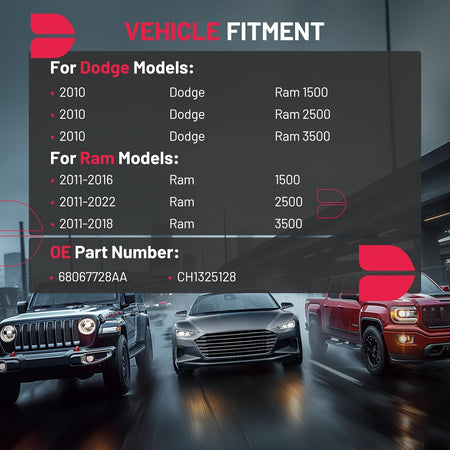 [Compatibility] Compatible with Dodge Ram 1500 2010, Compatible with Dodge Ram 2500 2010 , Compatible with Dodge Ram 3500 2010 , Compatible with Ram 1500 2011-2016, Compatible with Ram 2500 2011-2022, Compatible with Ram 3500 2011-2018. Before purchasing, please verify your vehicle model and the part number to ensure proper fitment.