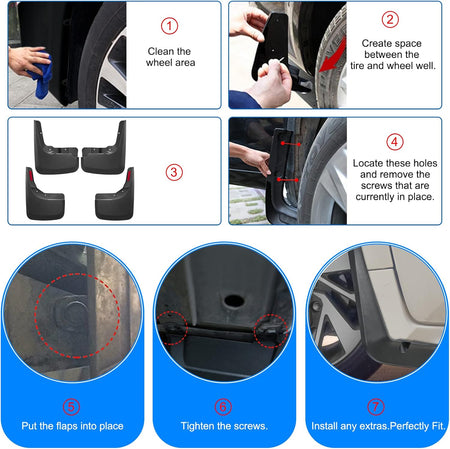 【Easy Installation】Fender flares for your car are fast and simple to install & remove. No drill is required, without wheel, or tire removal. There are holes in the fender, easy to install, and saves you time. A bag of fixings screws you need is included, just install them in the original hole position, and the splash guard will stay in place after the installation, perfectly matching your car model.