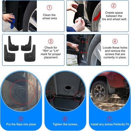 【Easy Installation】Fender flares for your car are fast and simple to install & remove. No drill is required, without wheel, or tire removal. There are holes in the fender, easy to install, and saves you time. A bag of fixings screws you need is included, just install them in the original hole position, and the splash guard will stay in place after the installation, perfectly matching your car model.