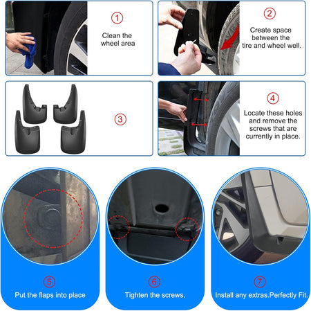 【Easy Installation】Fender flares for your car are fast and simple to install & remove. No drill is required, without wheel, or tire removal. There are holes in the fender, easy to install, and saves you time. A bag of fixings screws you need is included, just install them in the original hole position, and the splash guard will stay in place after the installation, perfectly matching your car model.