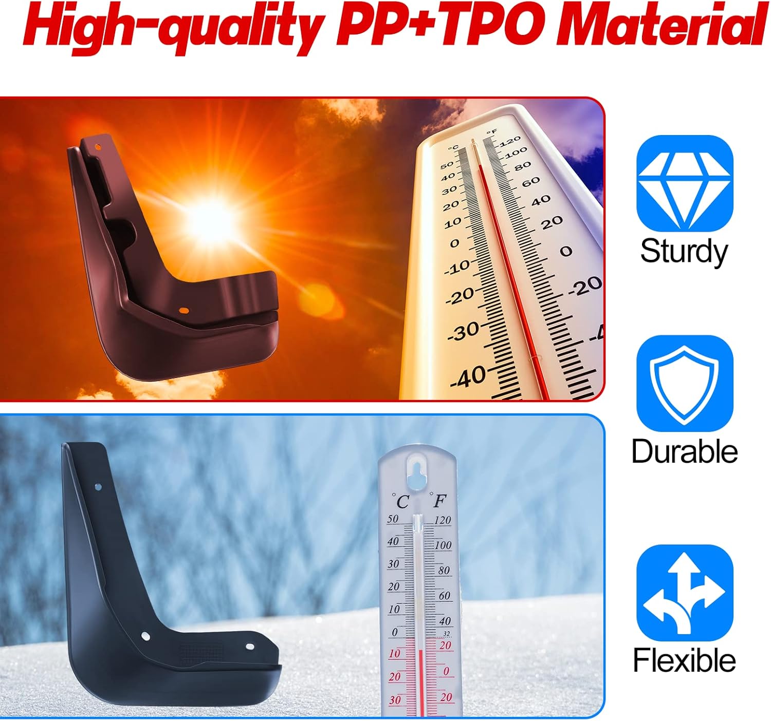 【Strong Material】Mud guards made of top-quality PP(Polypropylene)+TPO(Thermoplastic polyolefin)materials, after rigorous tests ensure that the mud flaps for focus can work, such as low temperatures, rainy days, and snow day or dry. Protecting your car is easy to clean and reduces dirt.