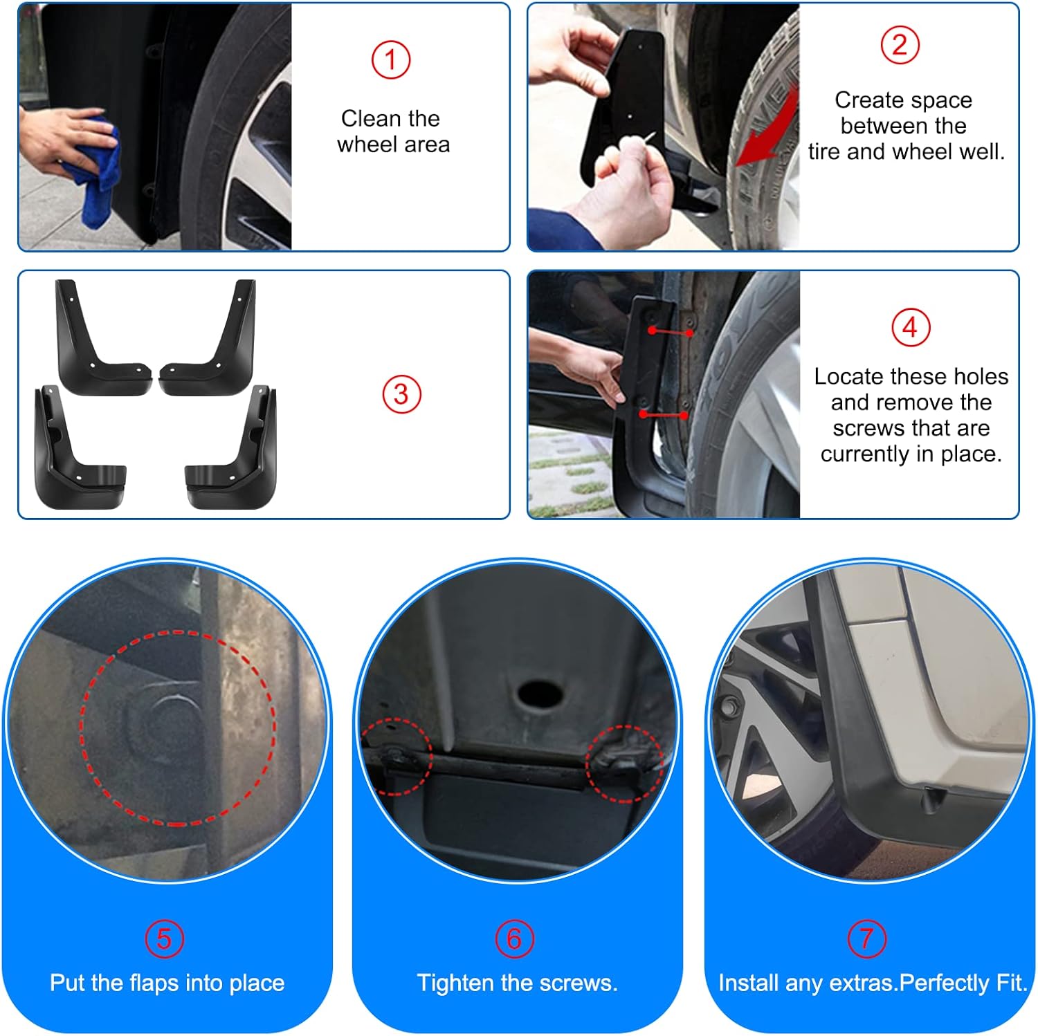 【Easy Installation】Fender flares for your car are fast and simple to install & remove. No drill is required, without wheel, or tire removal. There are holes in the fender, easy to install, and saves you time. A bag of fixings screws you need is included, just install them in the original hole position, and the splash guard will stay in place after the installation, perfectly matching your car model.